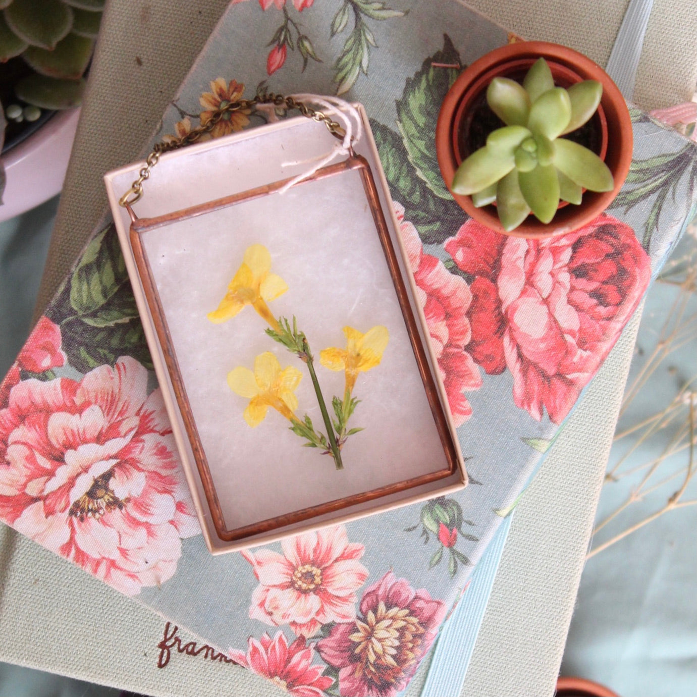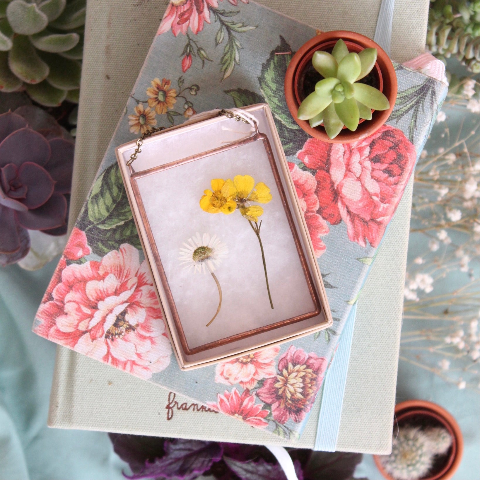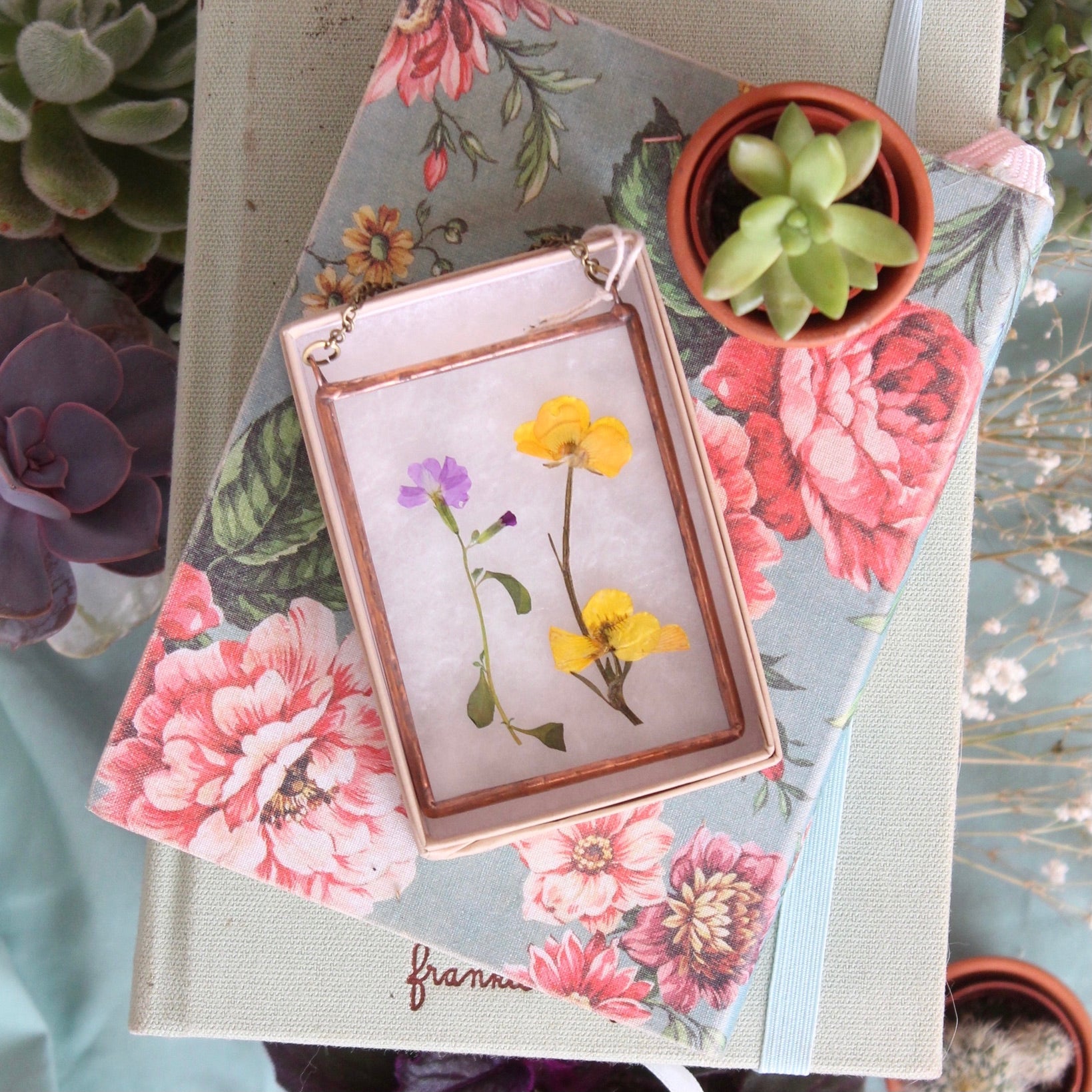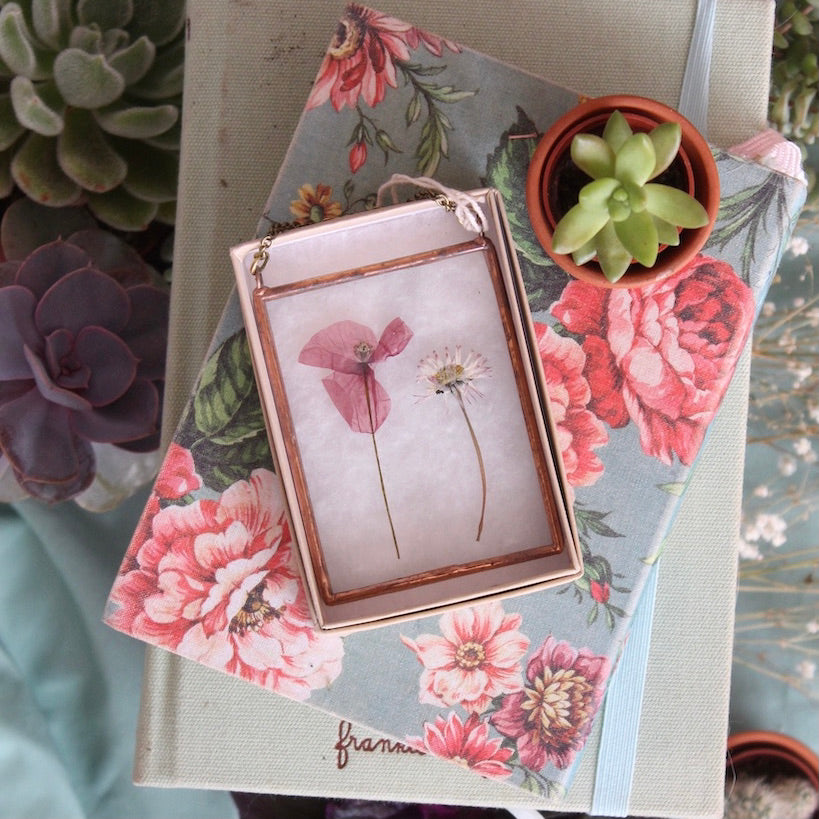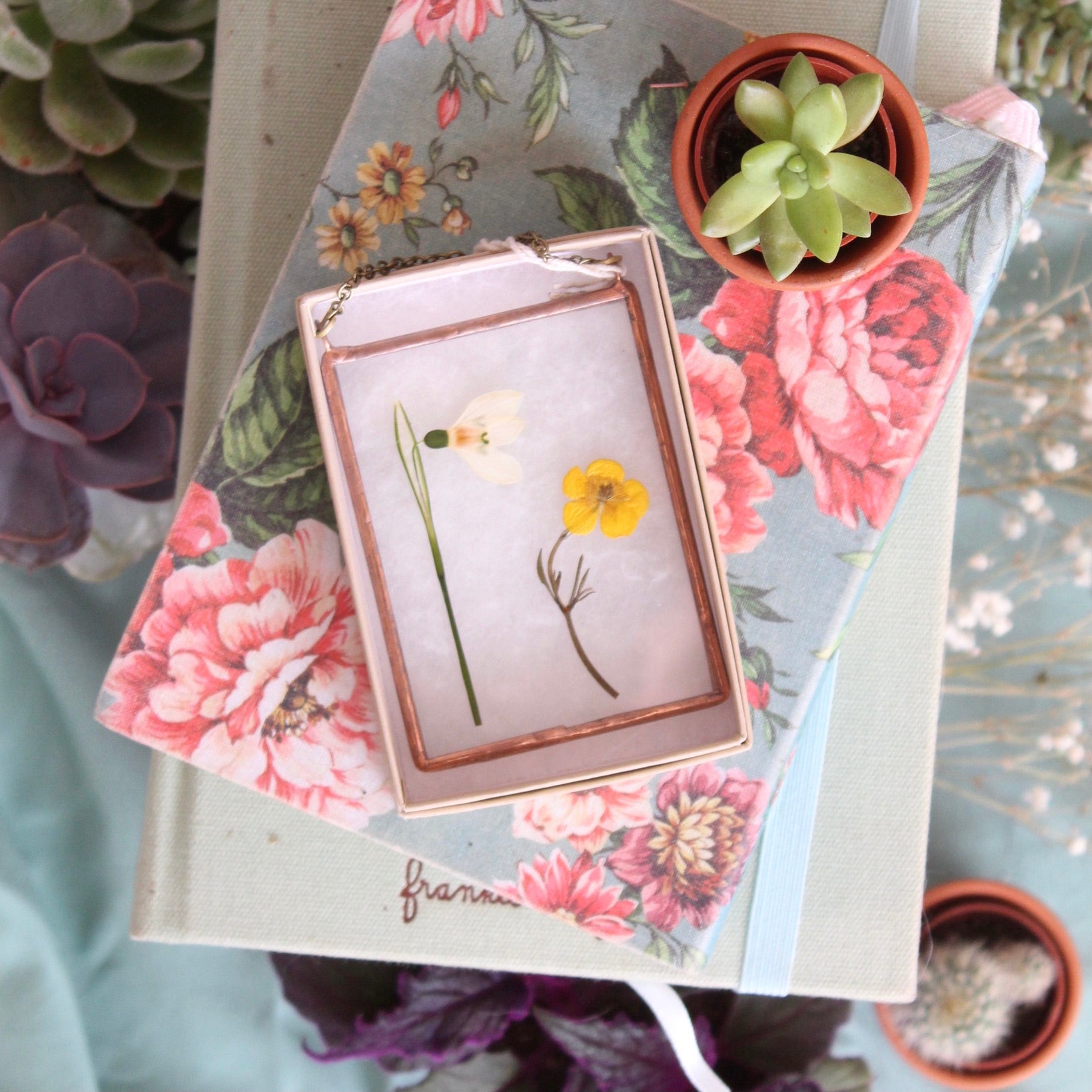Picked in full bloom, each flower is carefully pressed for two weeks to preserve its delicate character. Arranged between 2 sheets of glass, the flowers seem to float in their frames, pure and timeless. Sealed with solder, I bring a raw beauty to each unique piece.