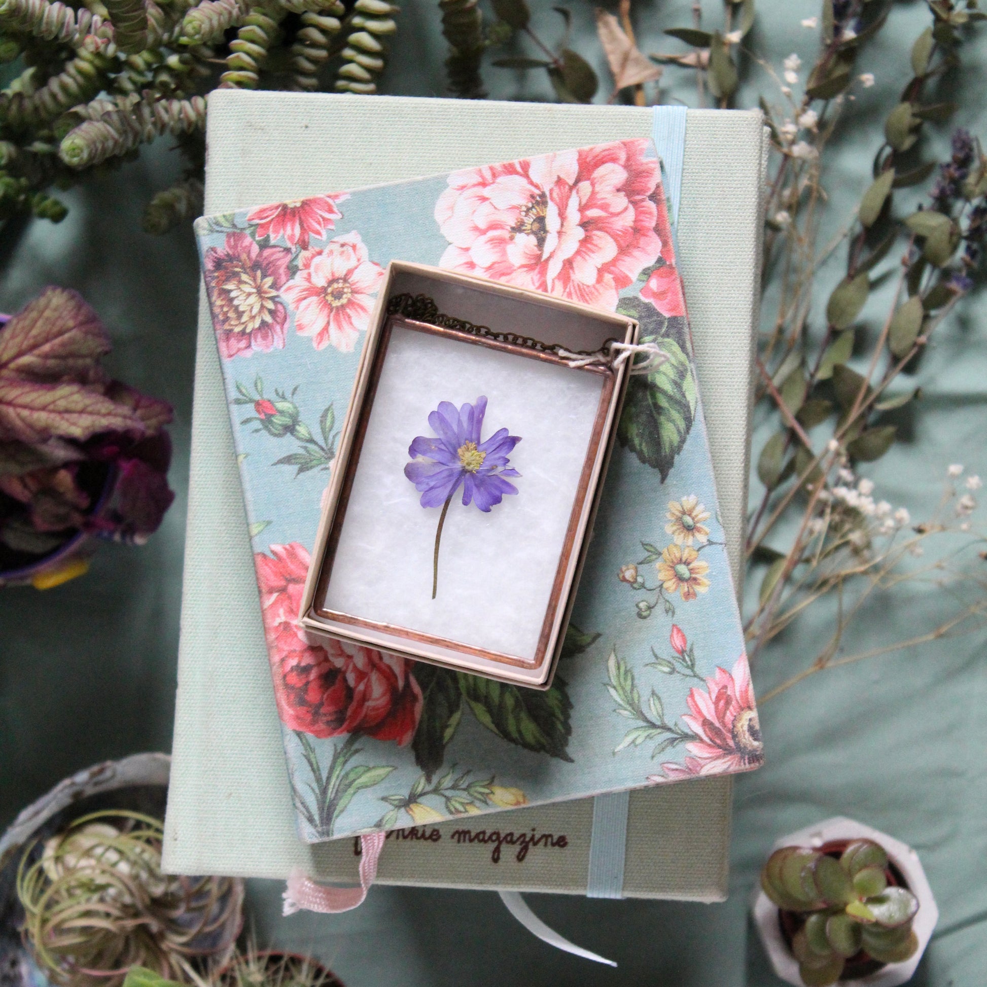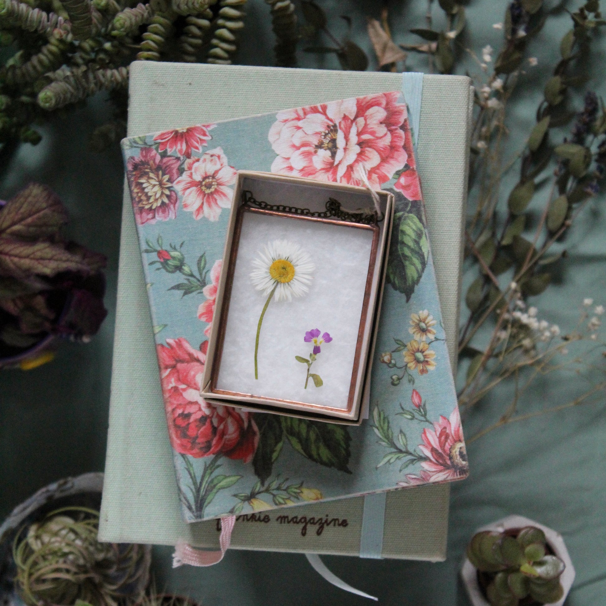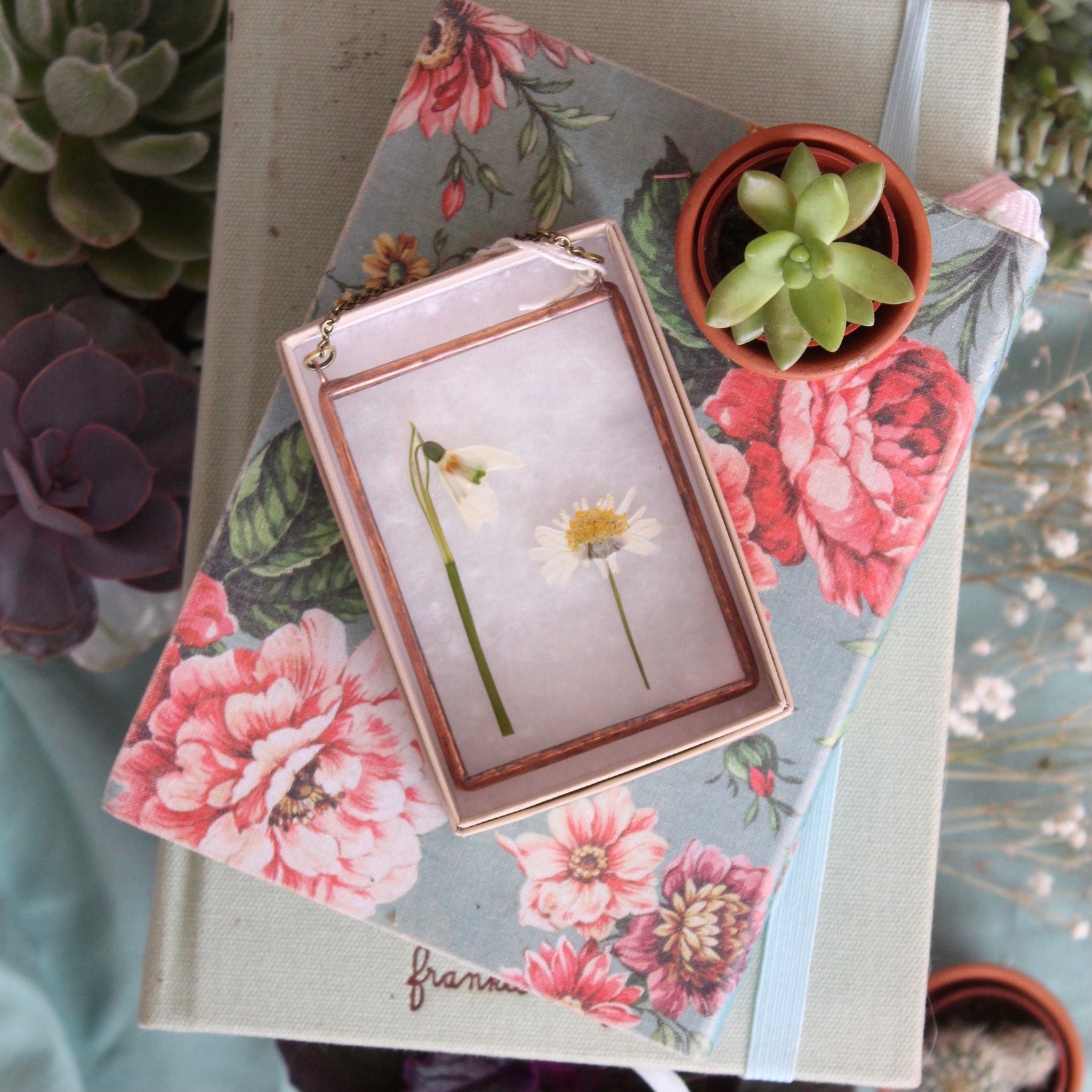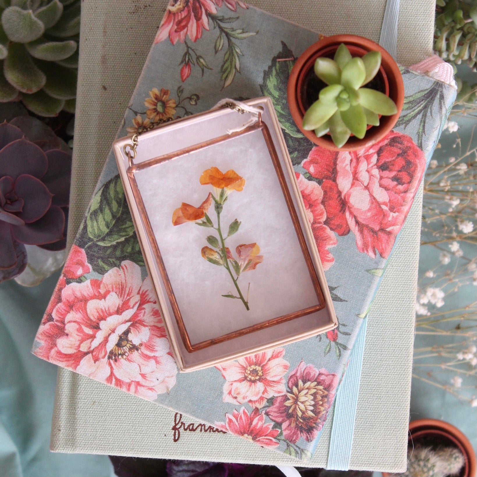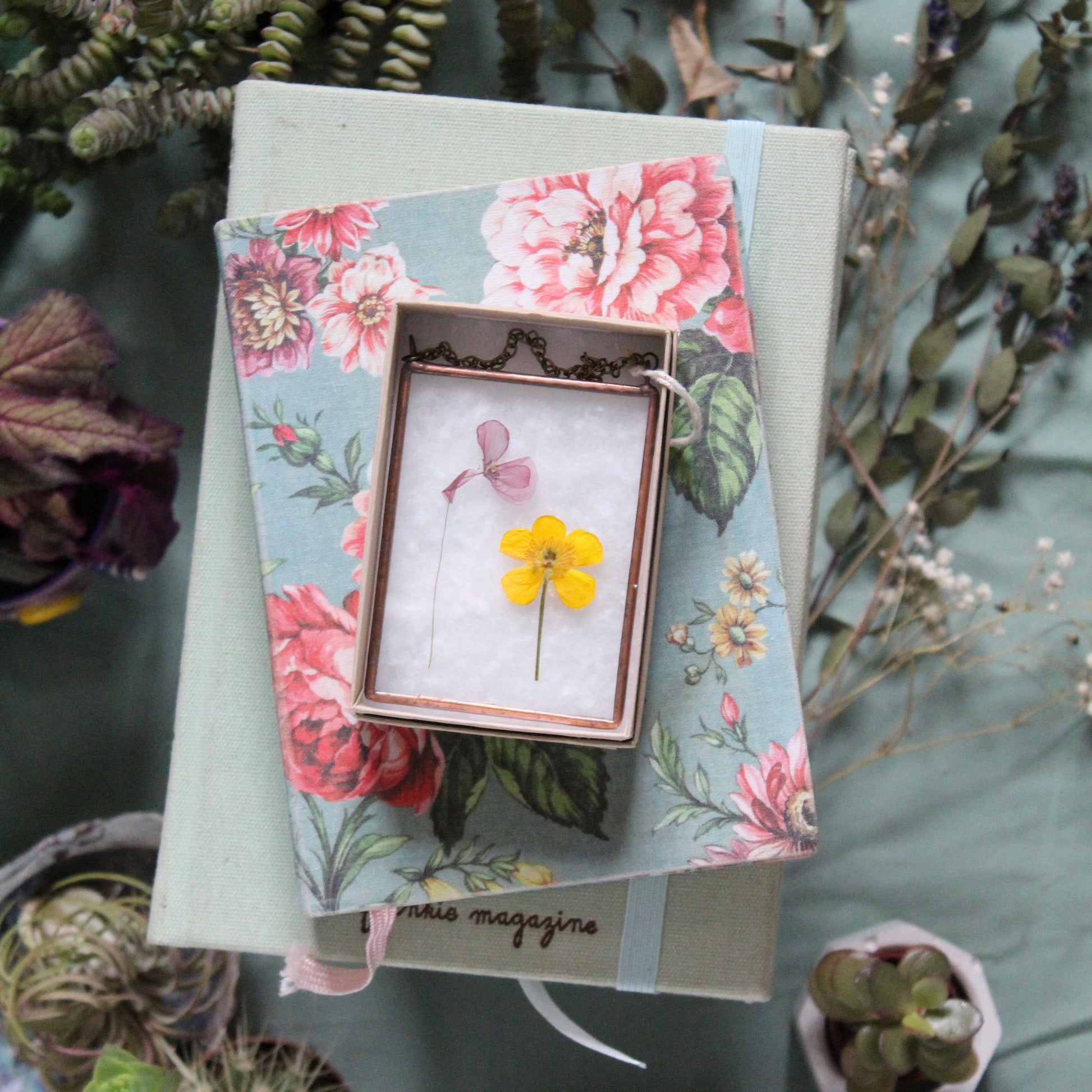 Picked in full bloom, each flower is carefully pressed for two weeks to preserve its delicate character. Arranged between 2 sheets of glass, the flowers seem to float in their frames, pure and timeless. Sealed with solder, I bring a raw beauty to each unique piece.