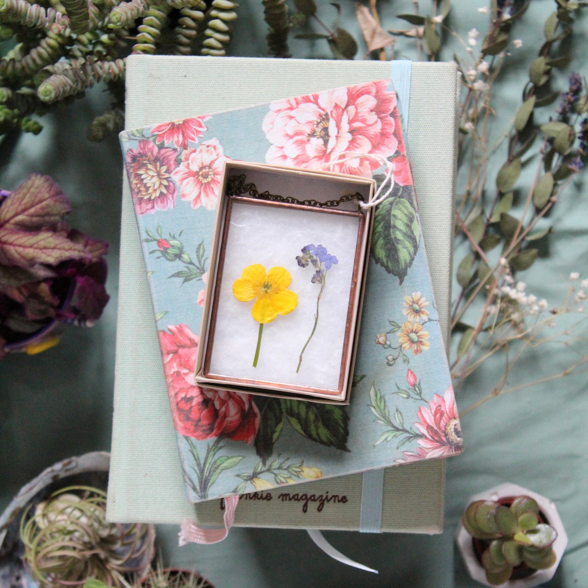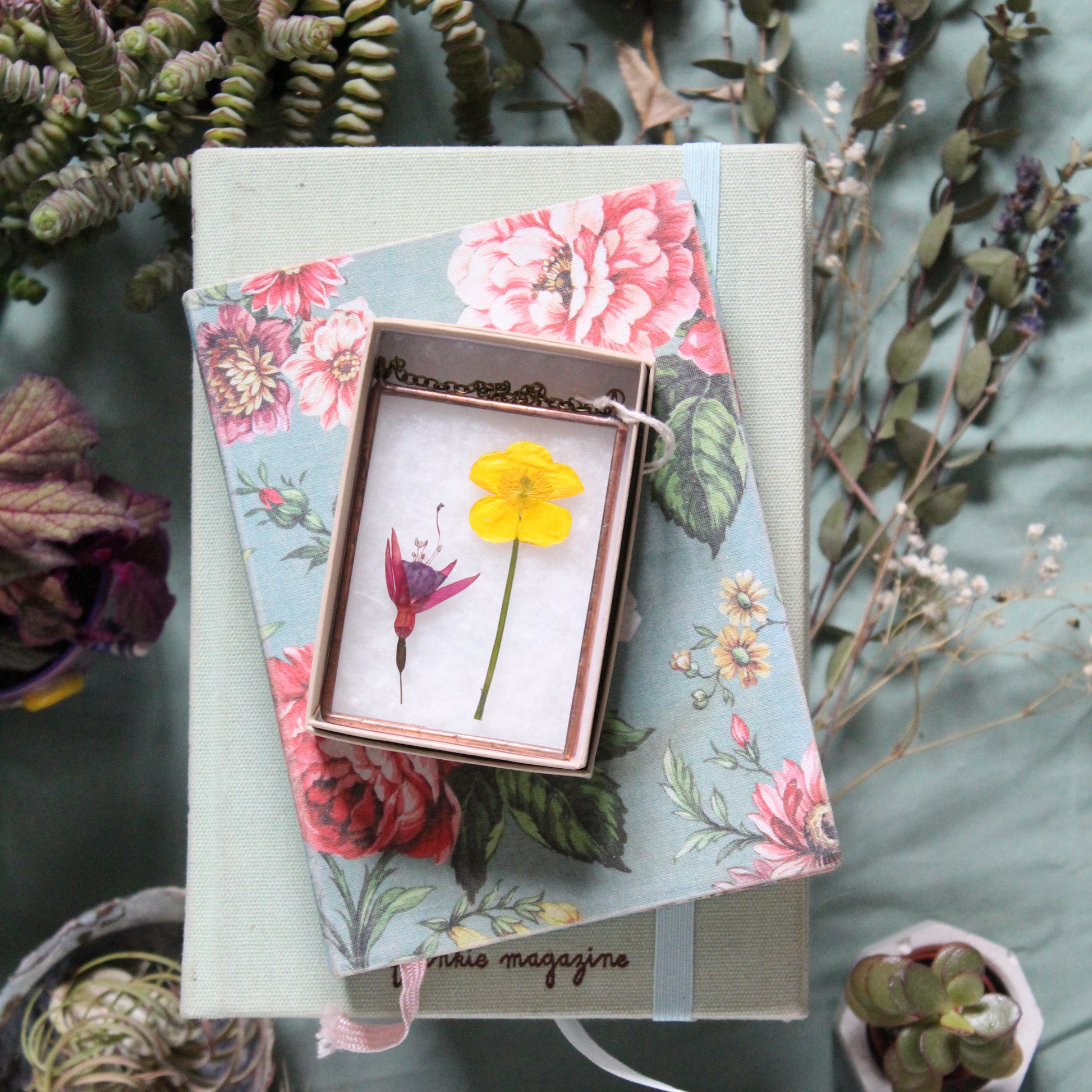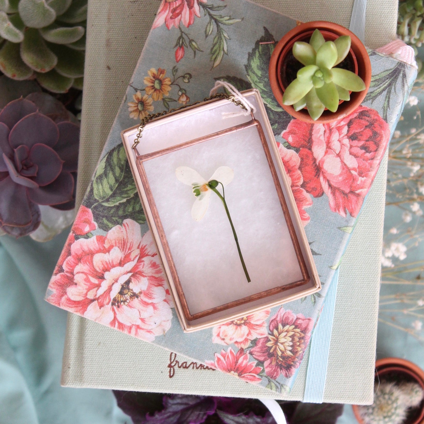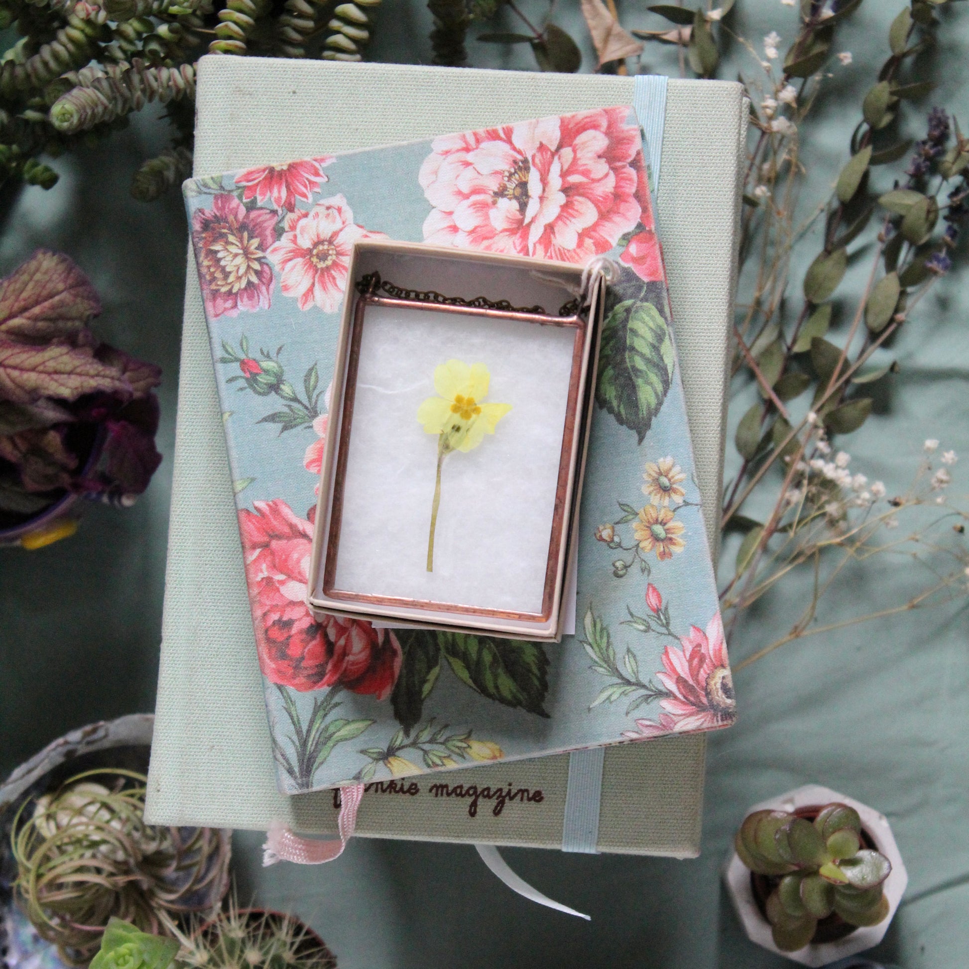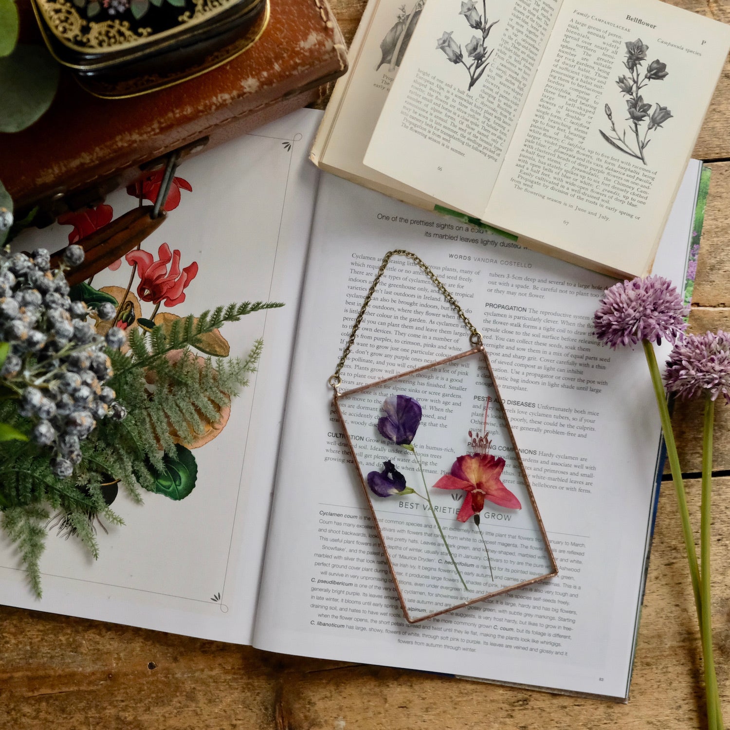 Picked in full bloom, each flower is carefully pressed for two weeks to preserve its delicate character. Arranged between 2 sheets of glass, the flowers seem to float in their frames, pure and timeless. Sealed with solder, I bring a raw beauty to each unique piece.