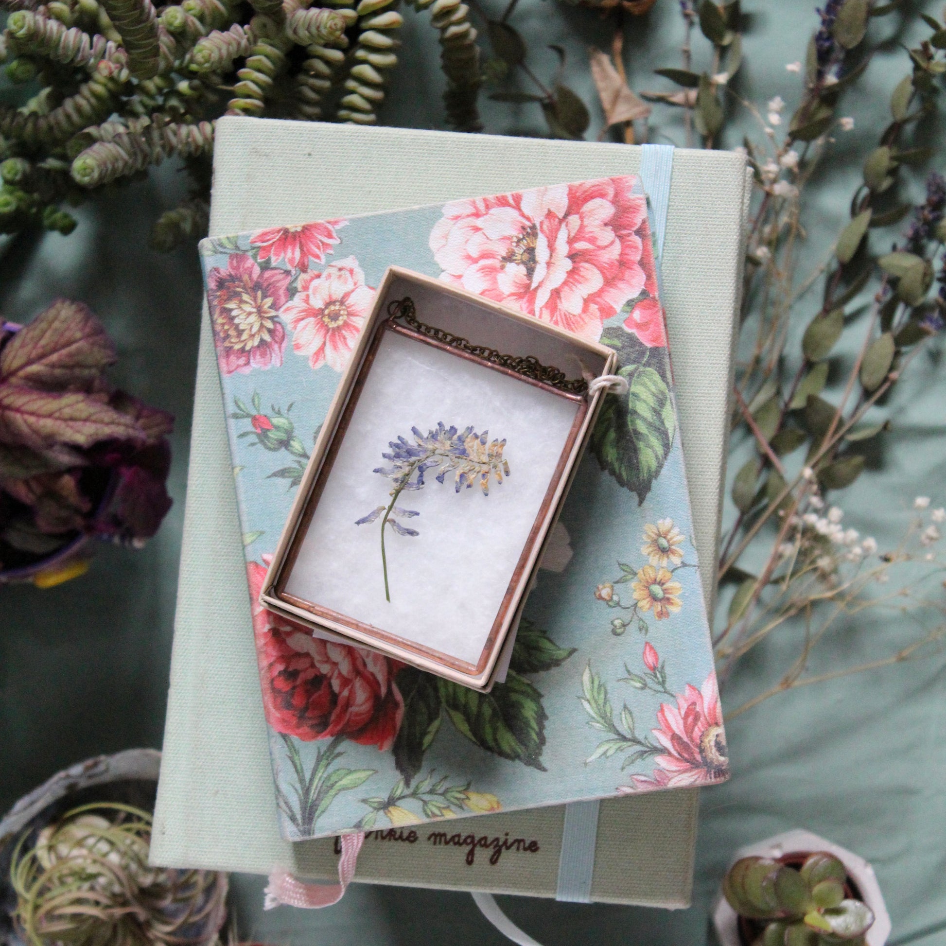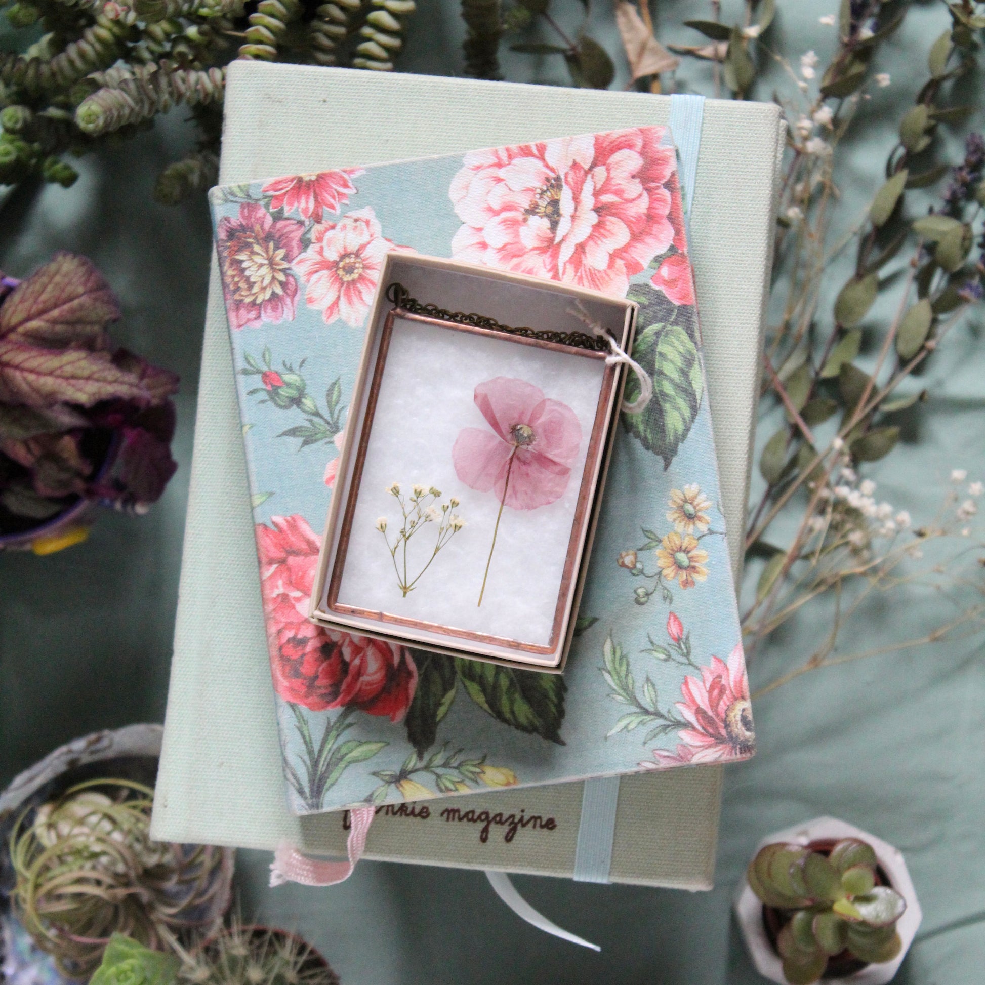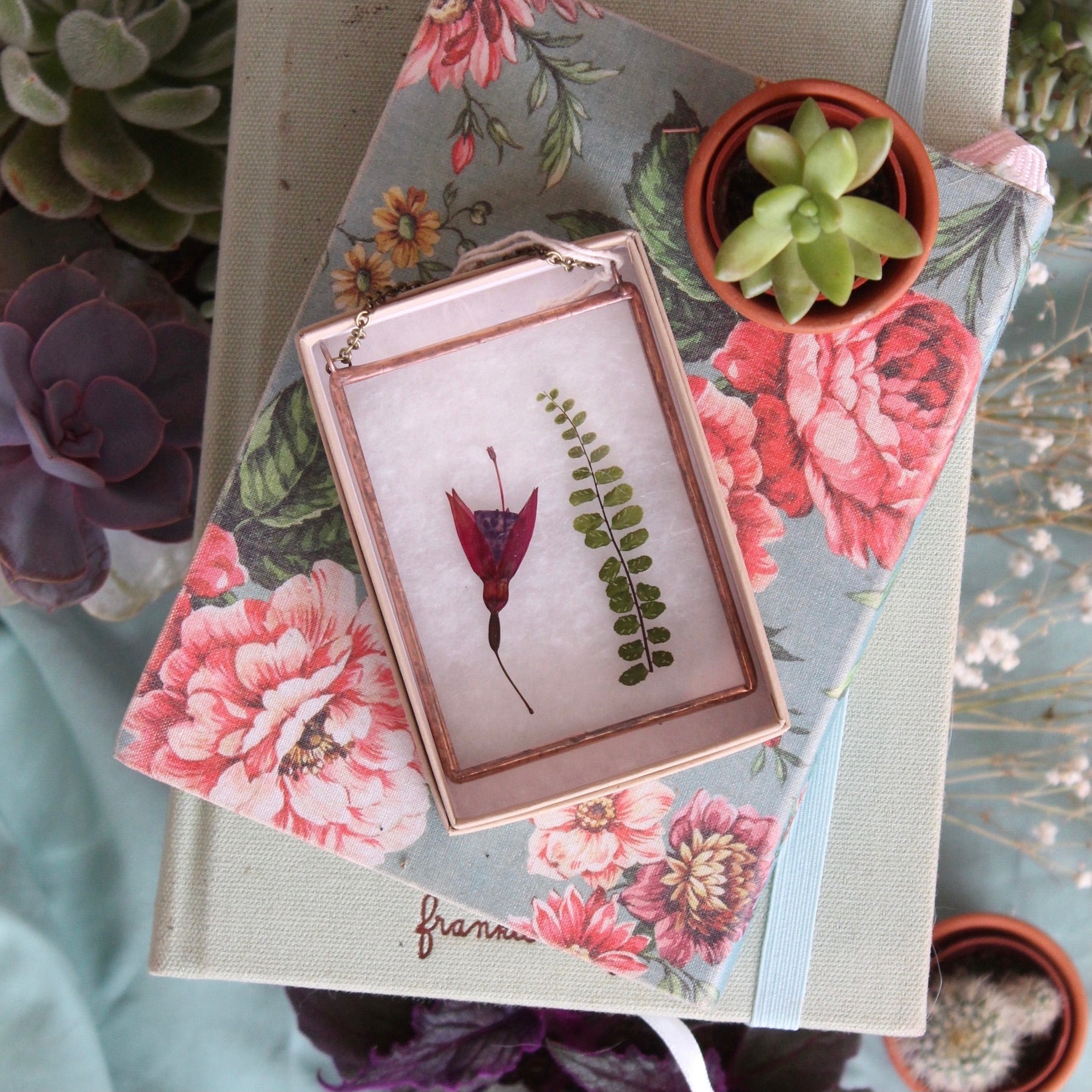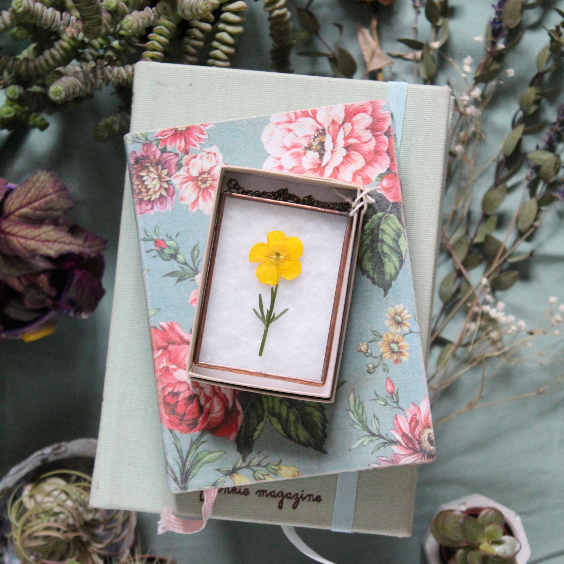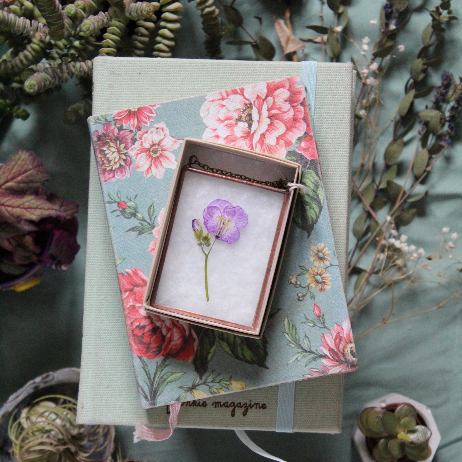 Picked in full bloom, each flower is carefully pressed for two weeks to preserve its delicate character. Arranged between 2 sheets of glass, the flowers seem to float in their frames, pure and timeless. Sealed with solder, I bring a raw beauty to each unique piece.
