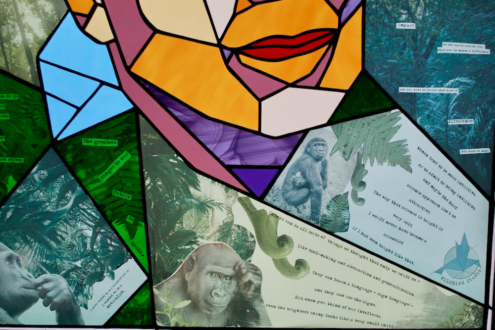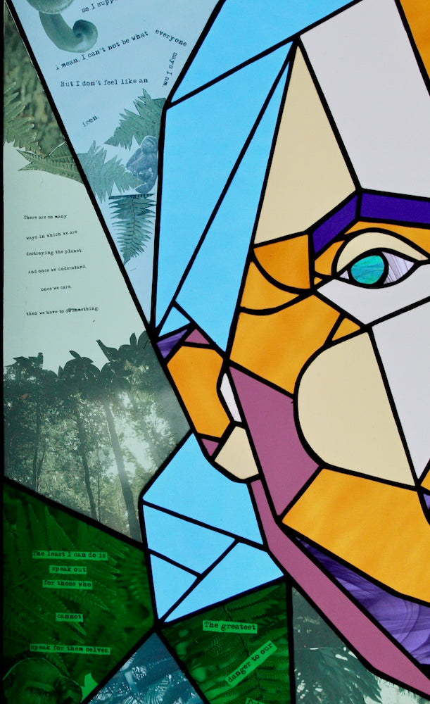 Dr Jane Goodall is the first of this series. An exceptional woman who has inspired me since I was a child, I set out to identify quotes that demonstrated her struggle, humility, wisdom and intelligence. I then created her portrait using the copper foil technique of stained glass, using ceramic decals for the imagery. The piece is framed and backlit with LED lights.