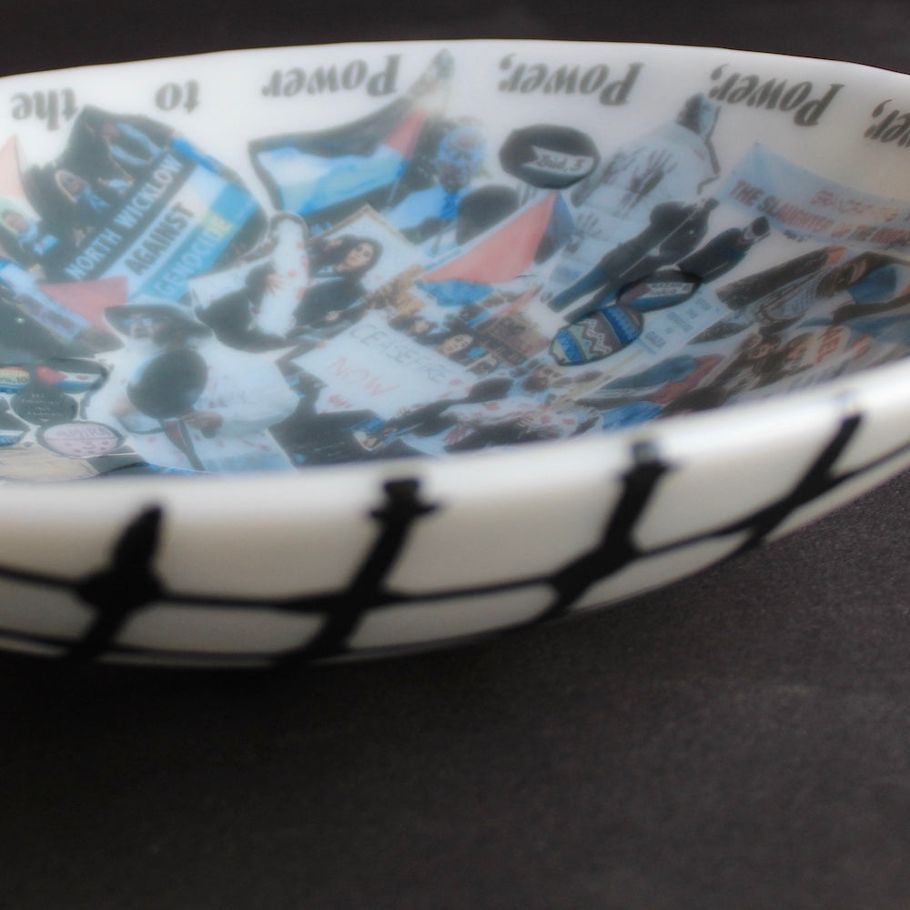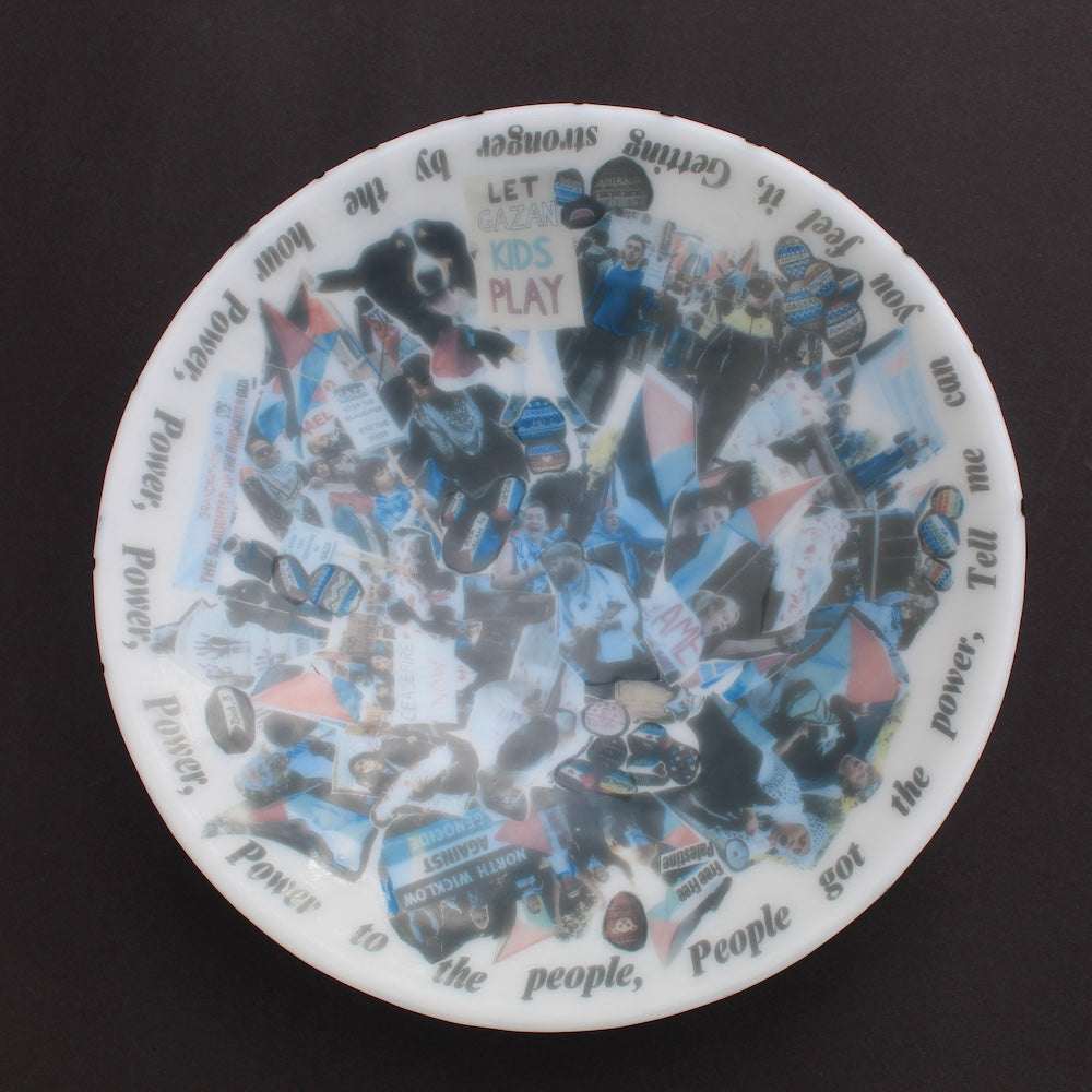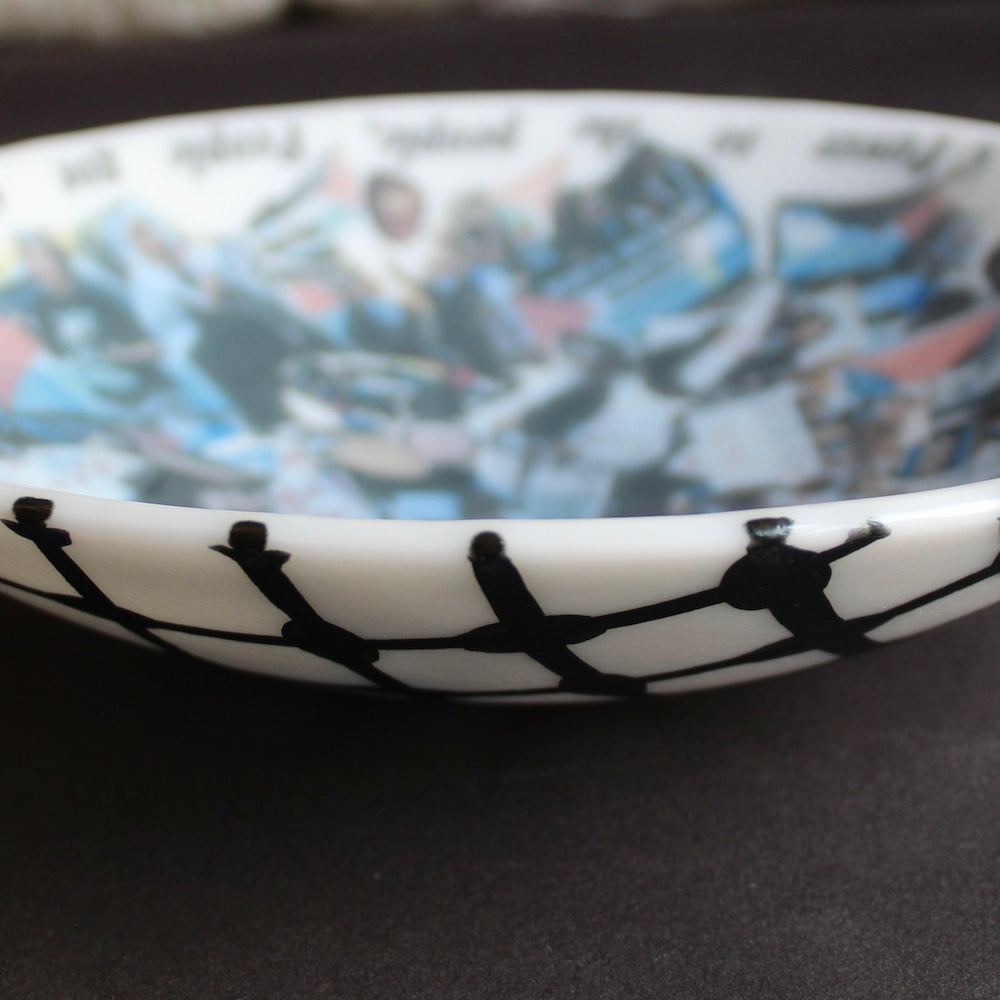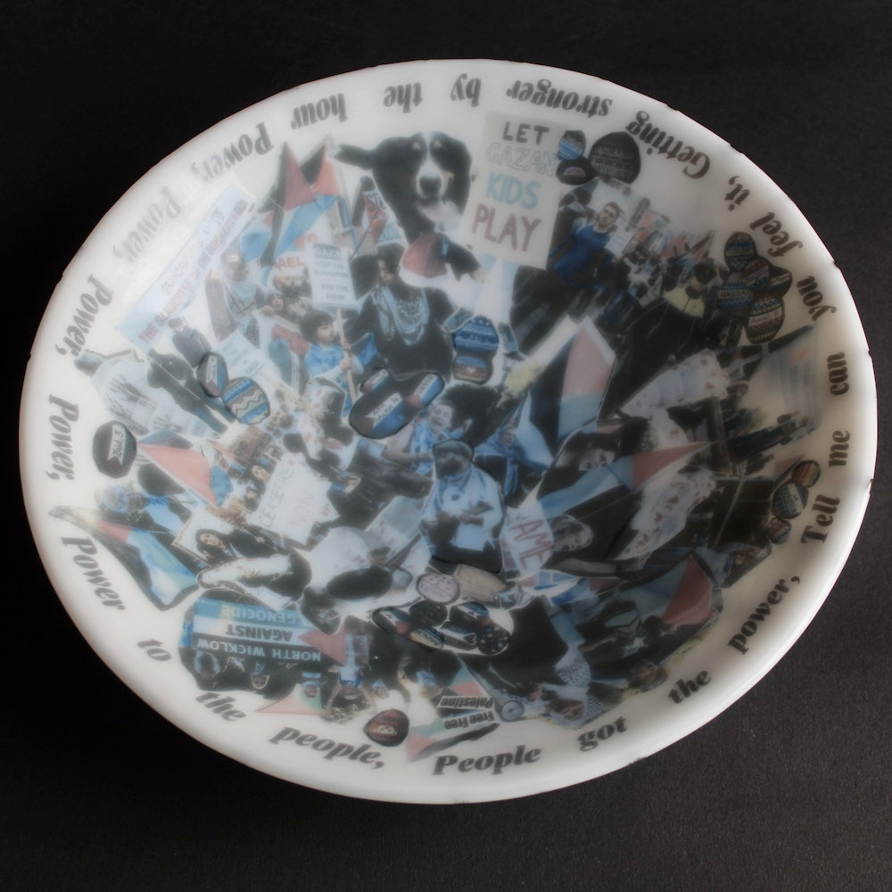 For this bowl, I put a call out to Pals for Palestine, asking them to share images from the protests, marches, and actions they had taken part in over the past year. These images were collated and transformed into ceramic decals, forming a kaleidoscopic collage across the surface of the bowl. Children, animals, singing, chanting, dancing, people coming together. On the opposing side, I painted a keffiyeh pattern as a clear symbol of solidarity.