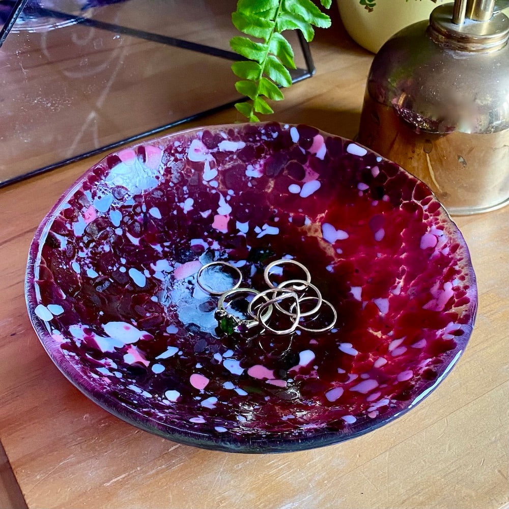 In the name of sustainability, I’ve come up with something new: ring dishes! These unique pieces are made using glass that’s been lying around my studio for years, just waiting to be turned into something special. By repurposing what I already have, I’m giving these beautiful fragments a new lease on life.