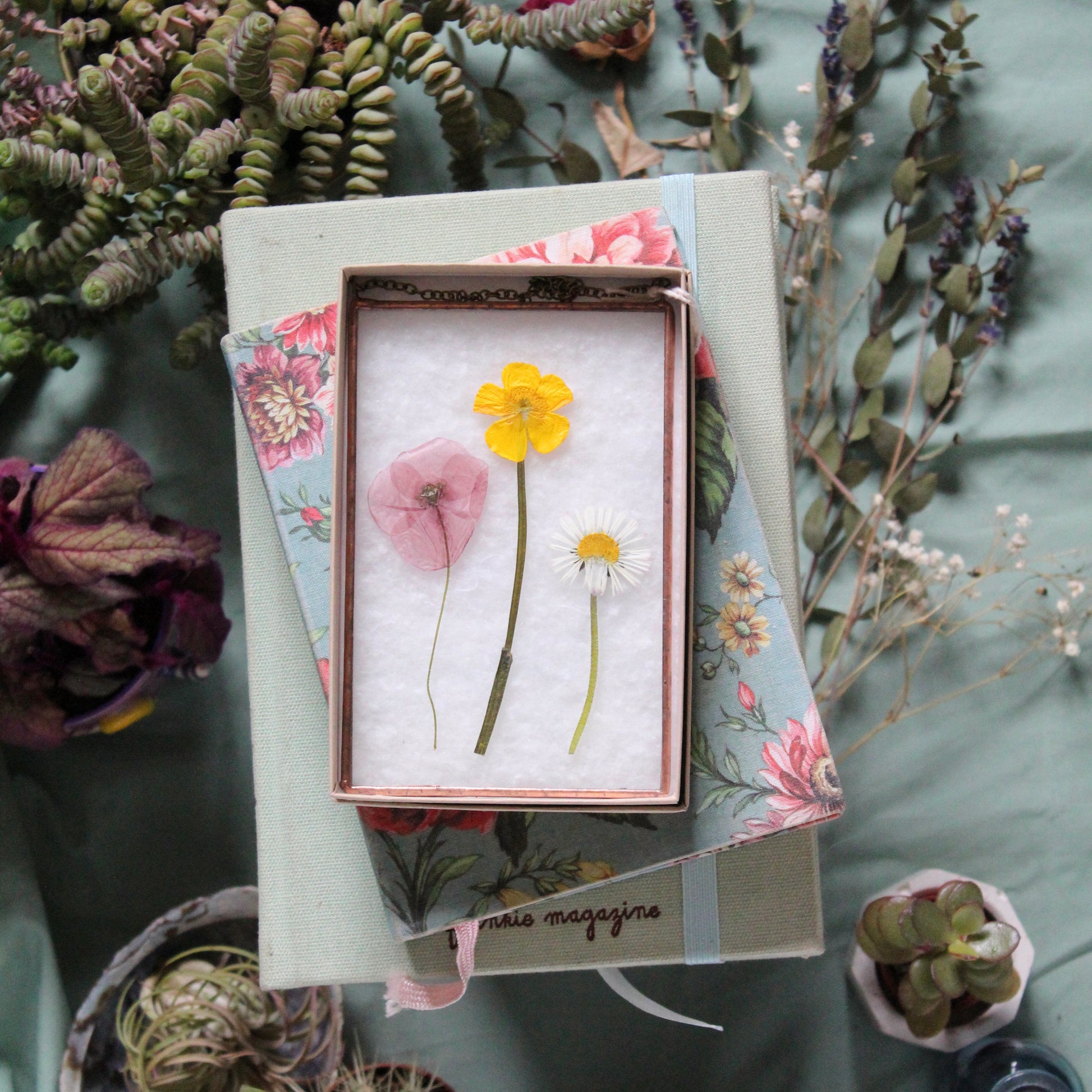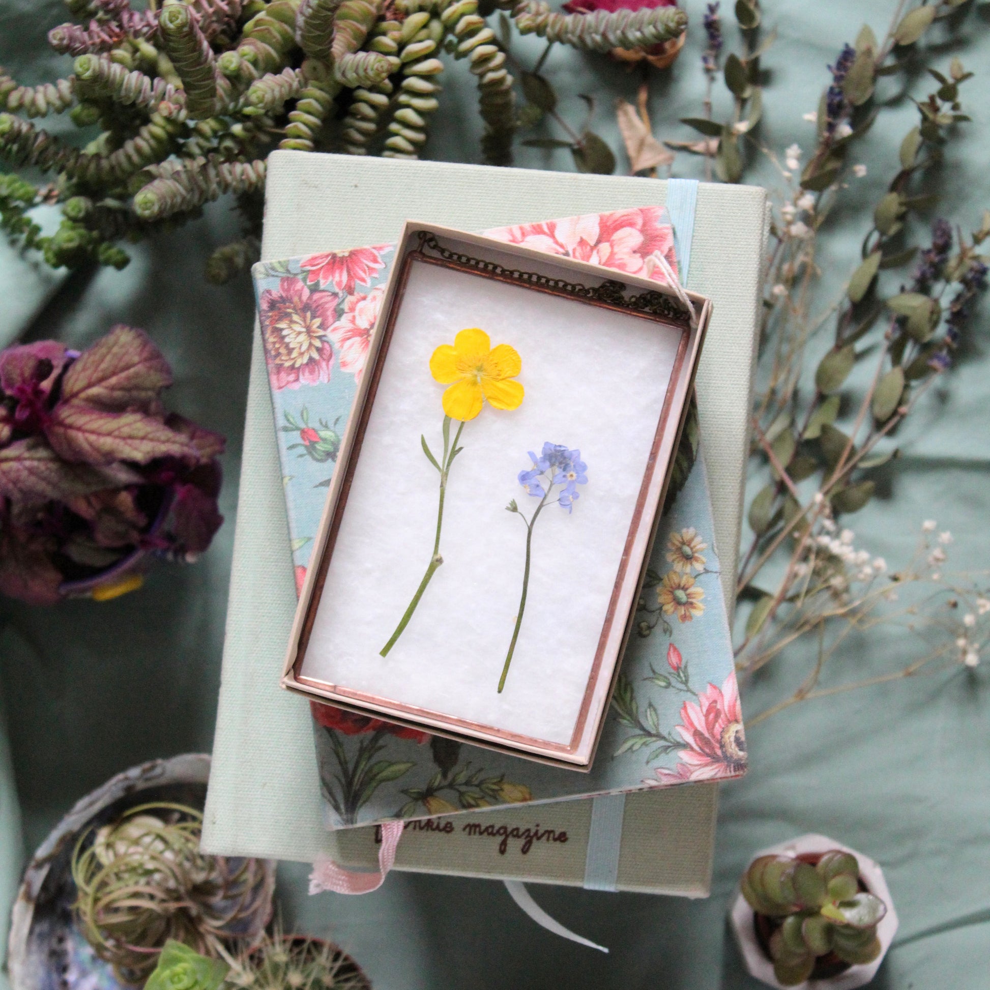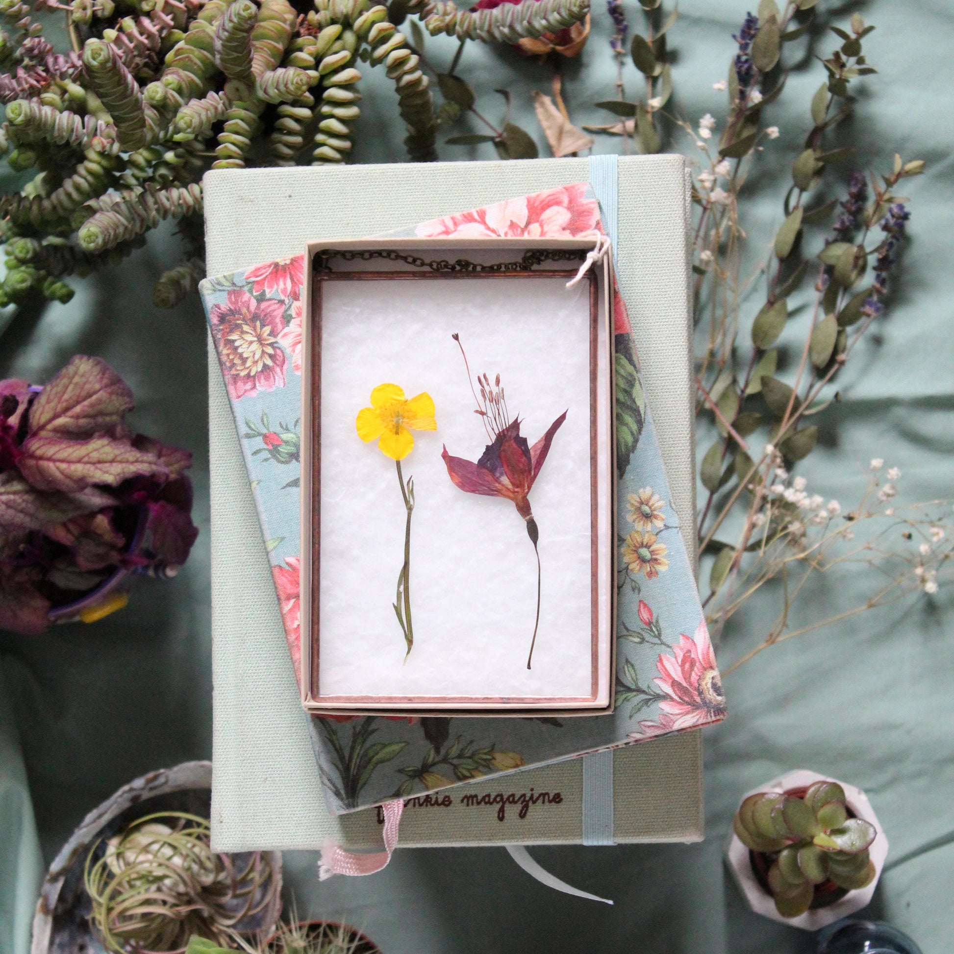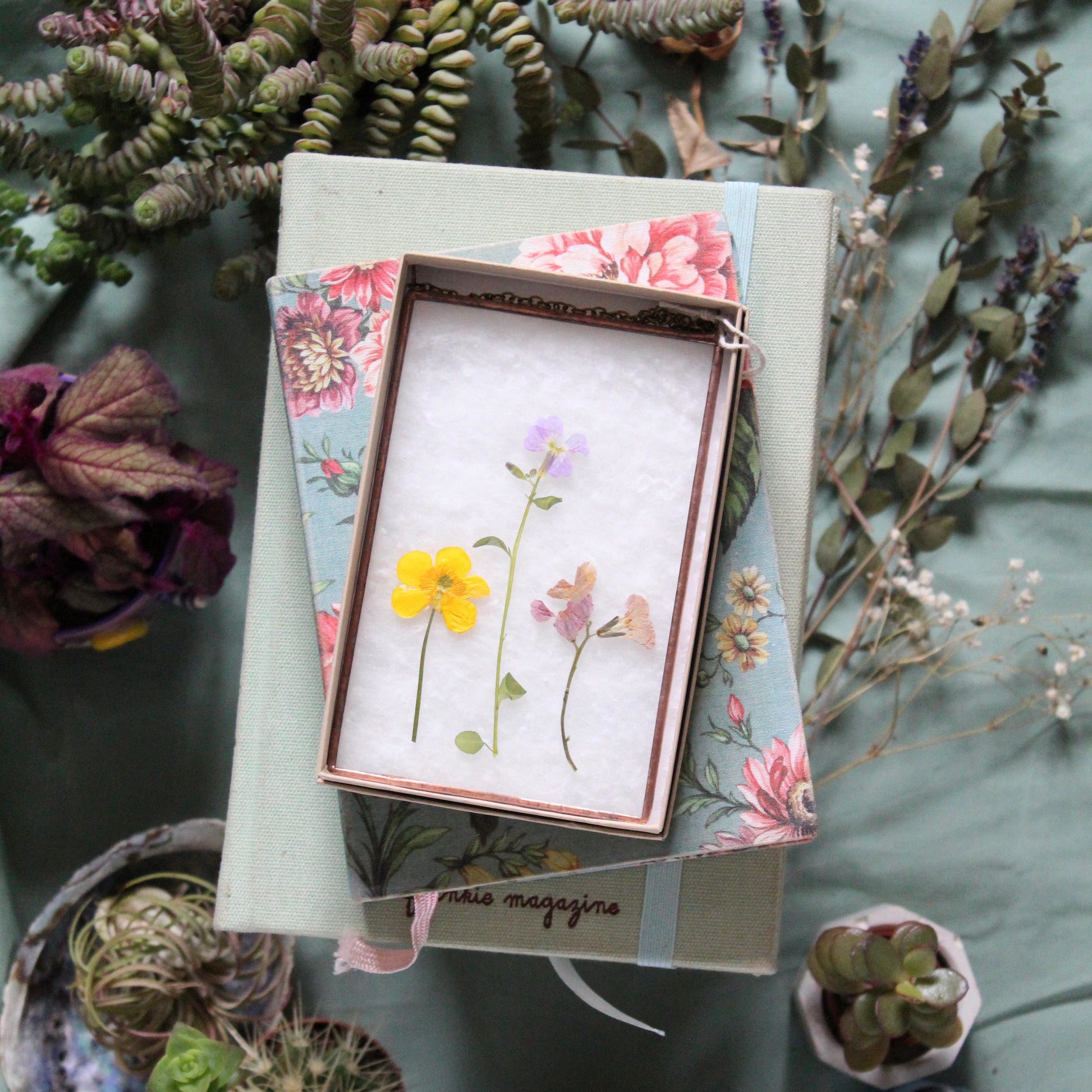 Picked in full bloom, each flower is carefully pressed for two weeks to preserve its delicate character. Arranged between 2 sheets of glass, the flowers seem to float in their frames, pure and timeless. Sealed with solder, I bring a raw beauty to each unique piece.