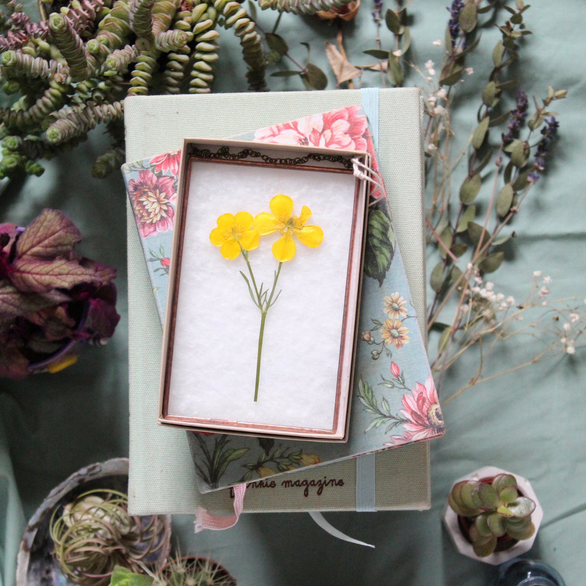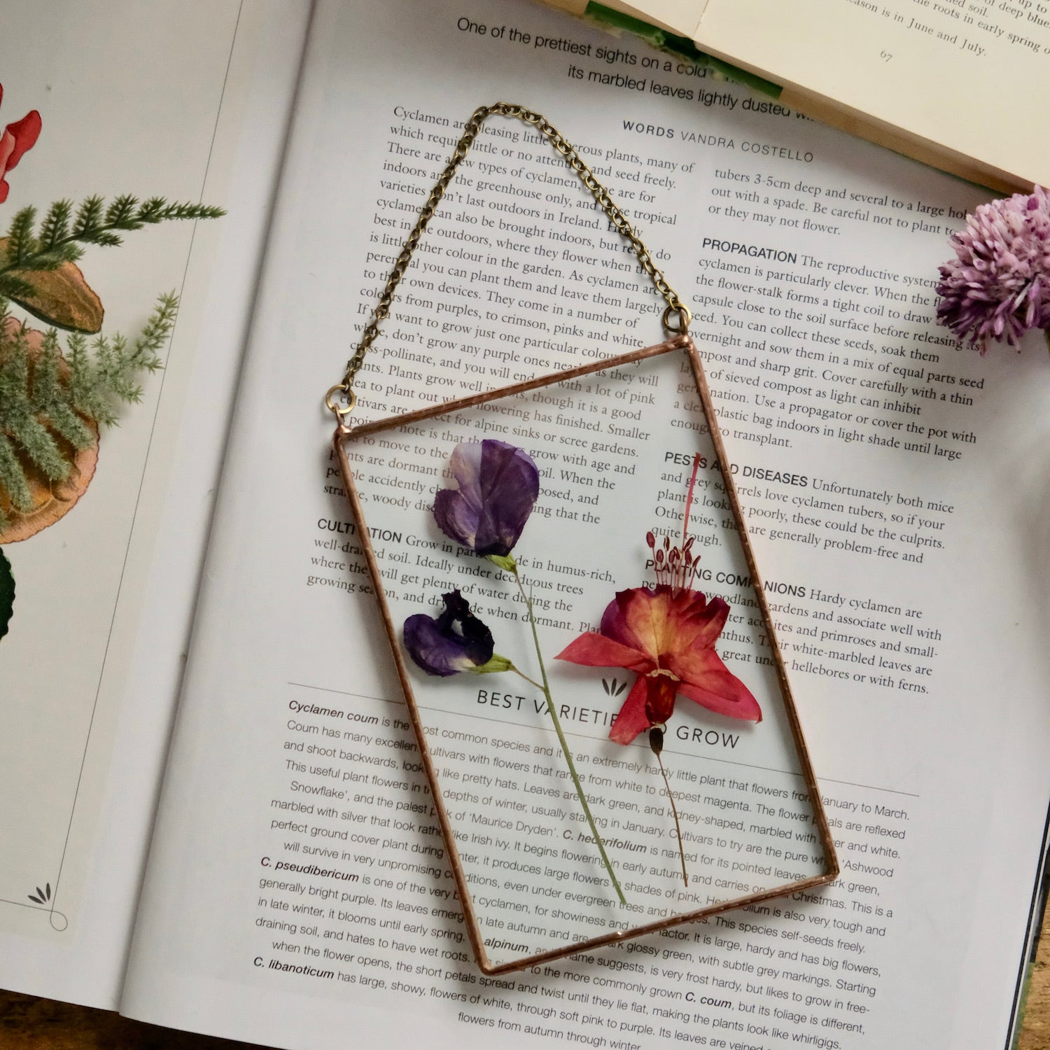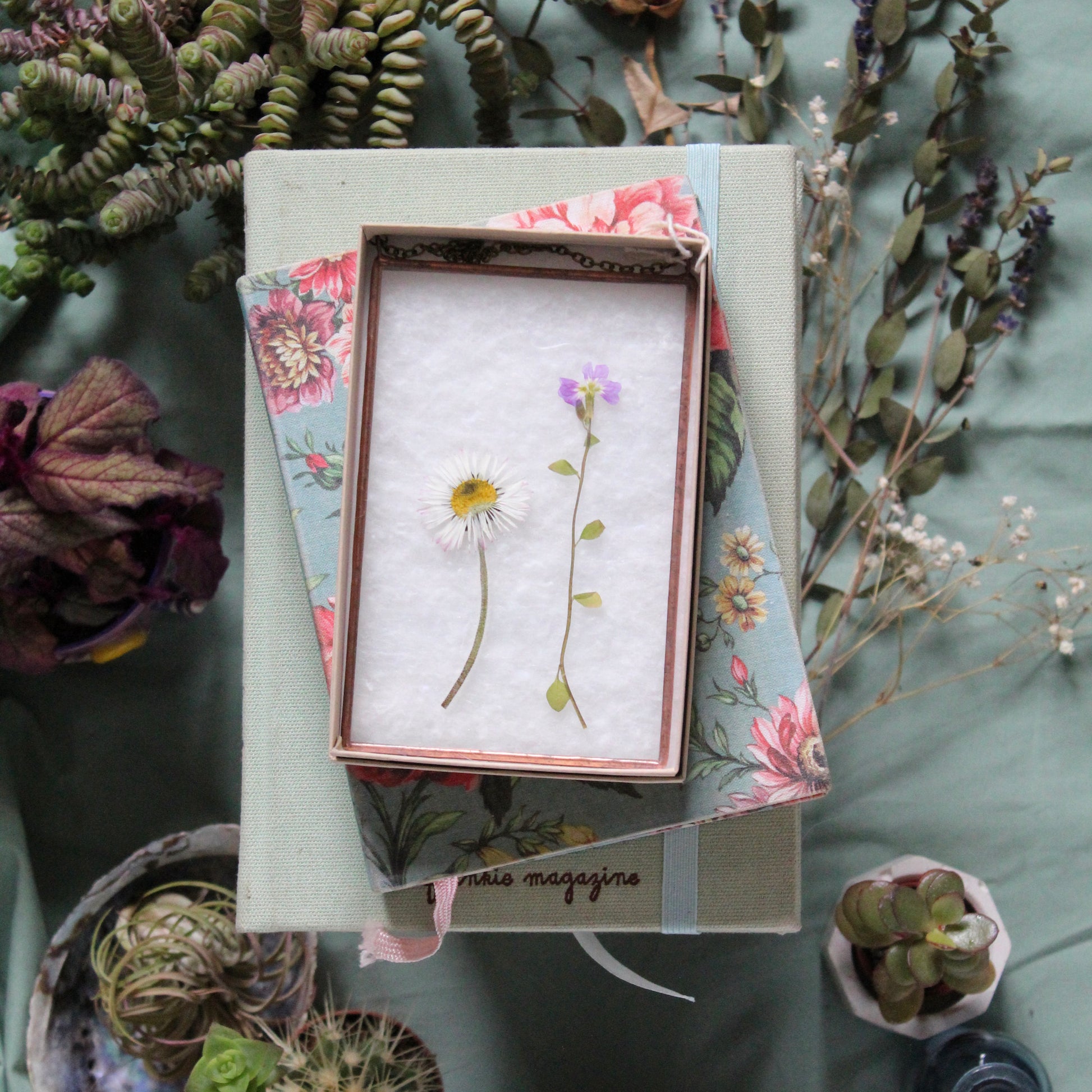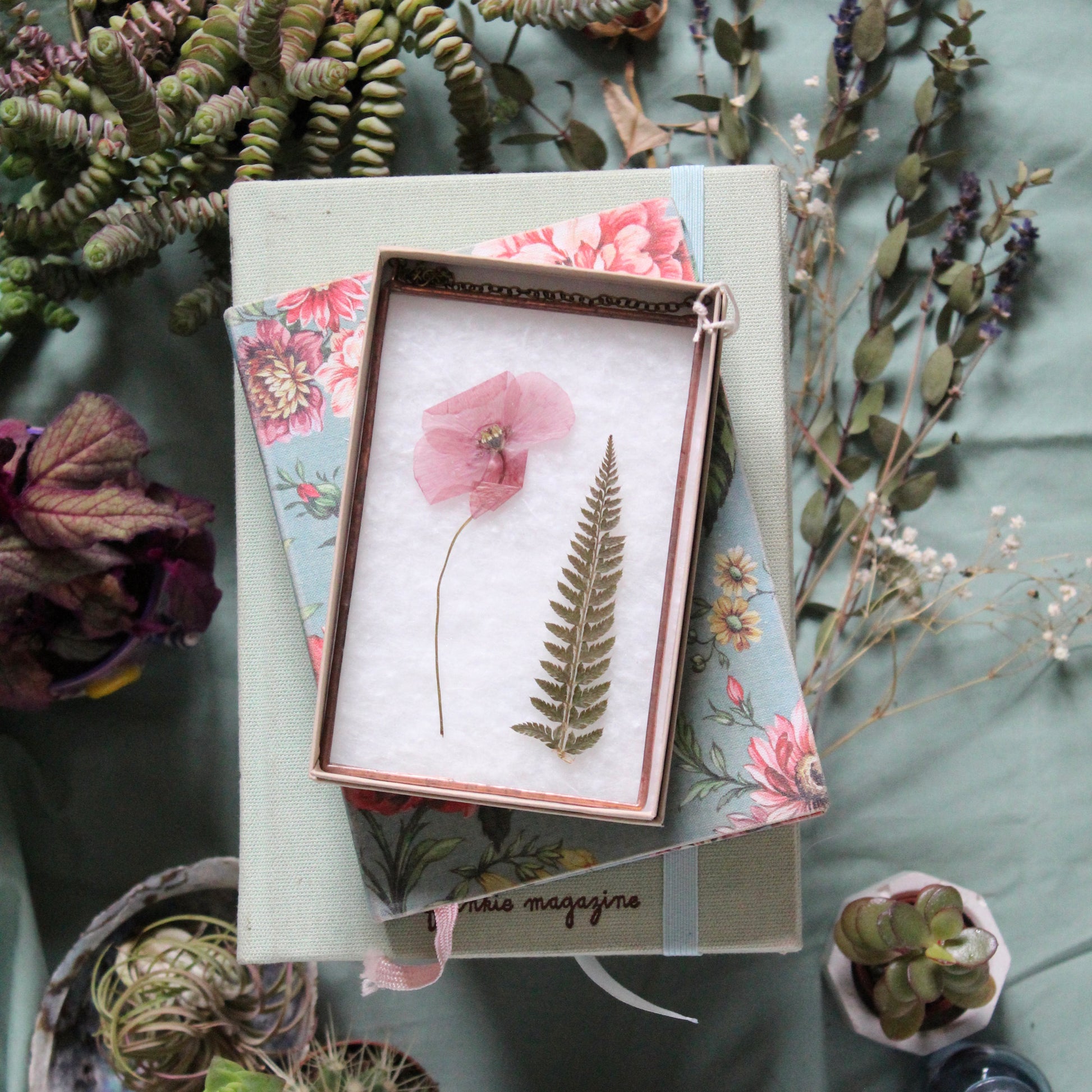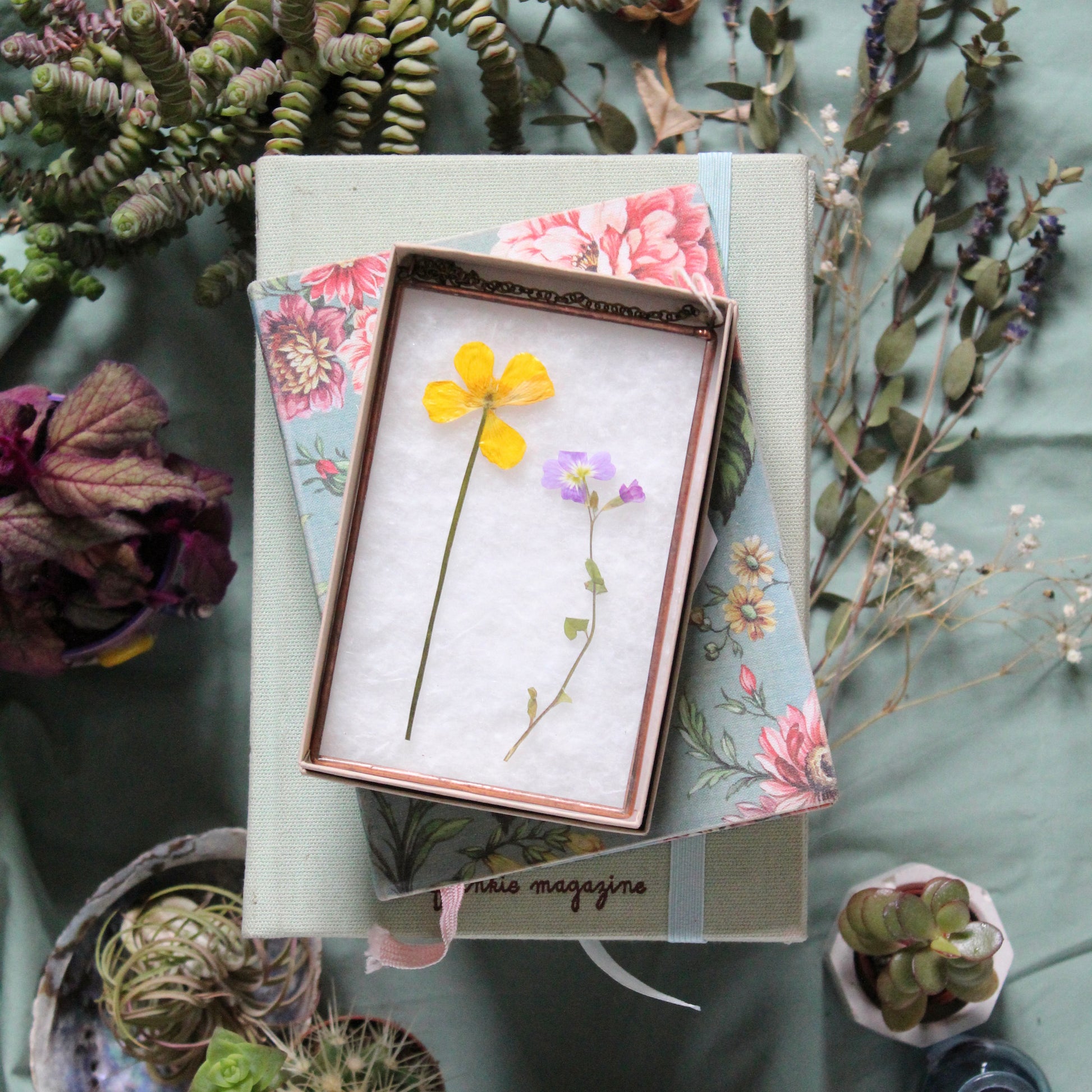 Picked in full bloom, each flower is carefully pressed for two weeks to preserve its delicate character. Arranged between 2 sheets of glass, the flowers seem to float in their frames, pure and timeless. Sealed with solder, I bring a raw beauty to each unique piece.
