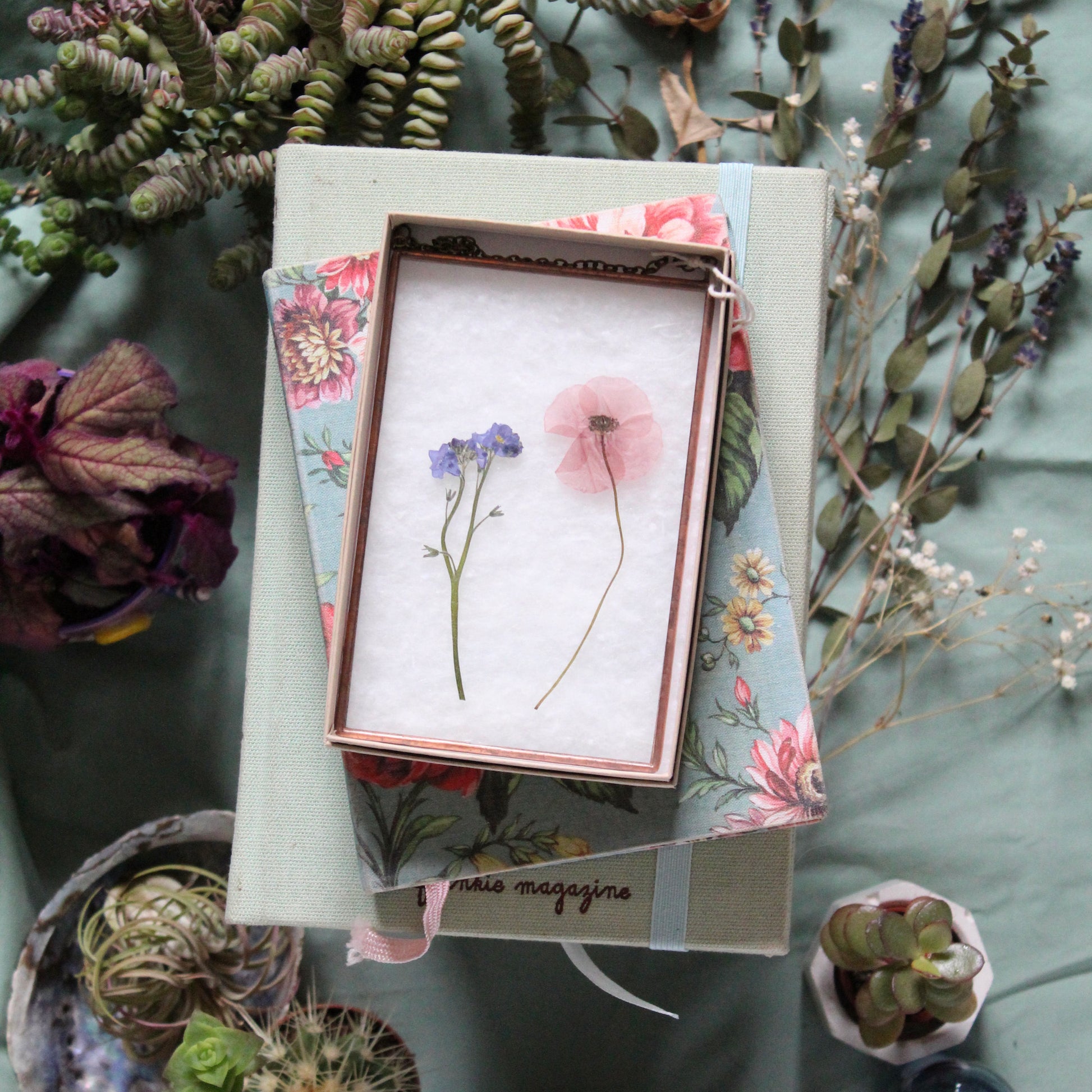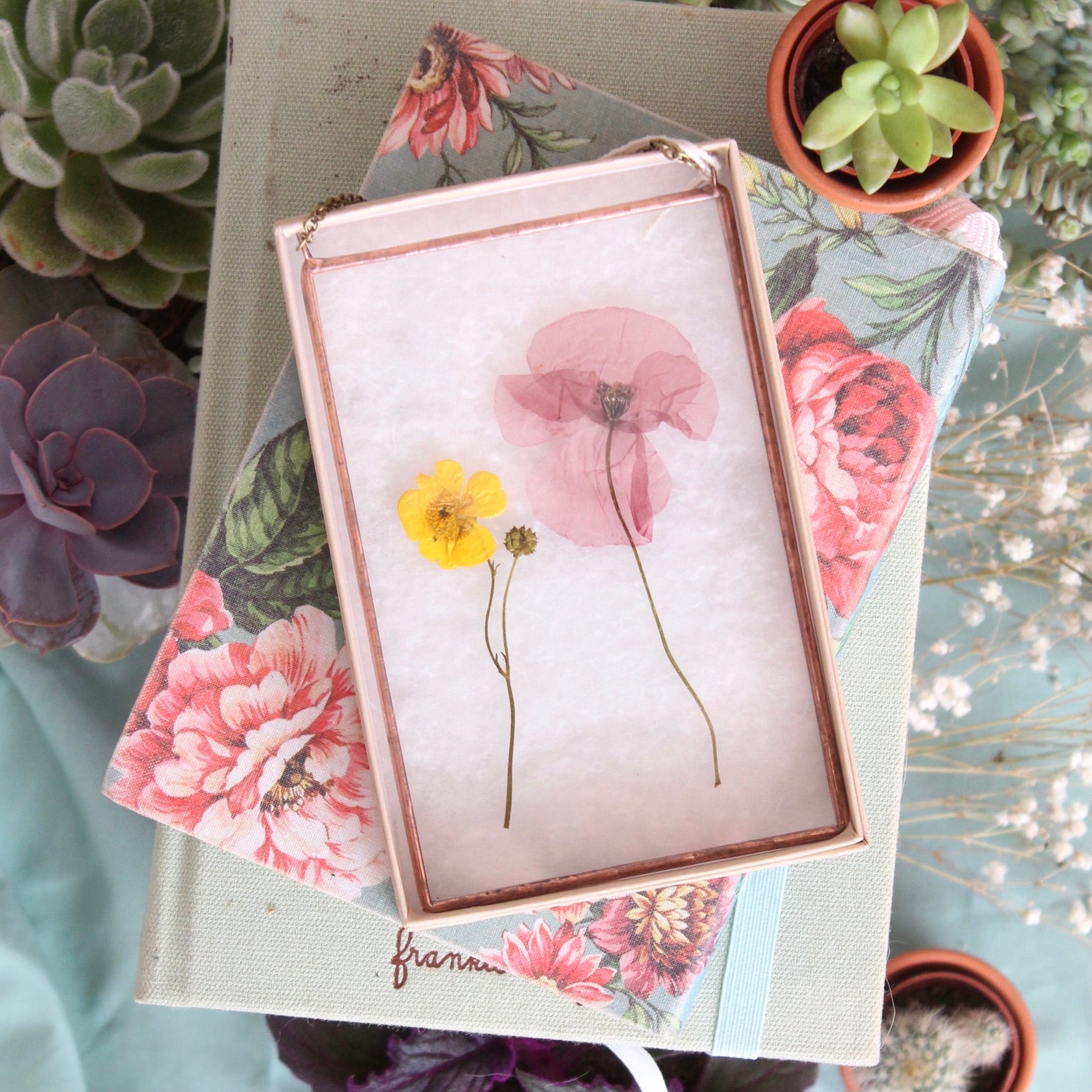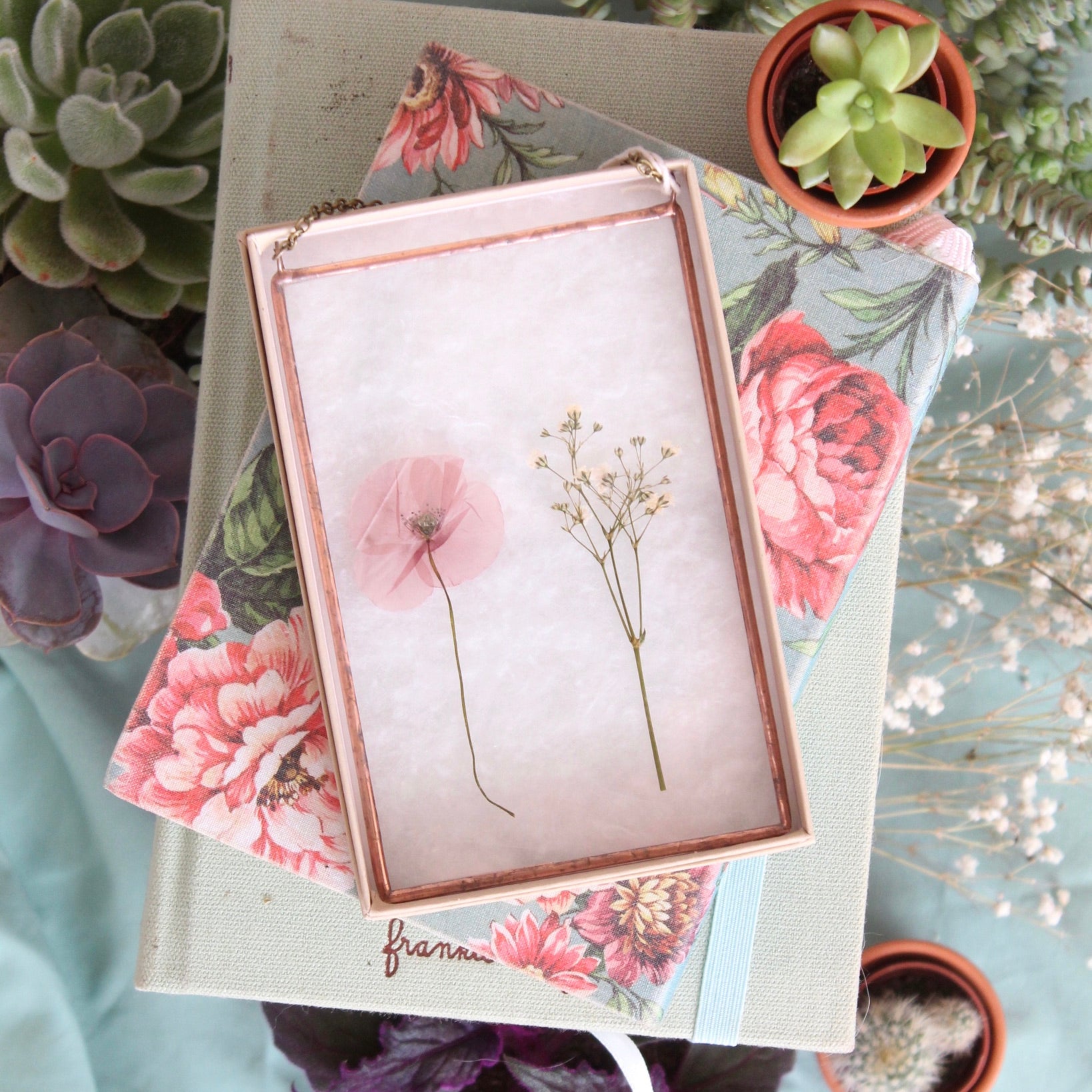 Each frame features real flowers whose colour will fade over time, so it is best to keep them out of direct sunlight. Comes in a copper finish.