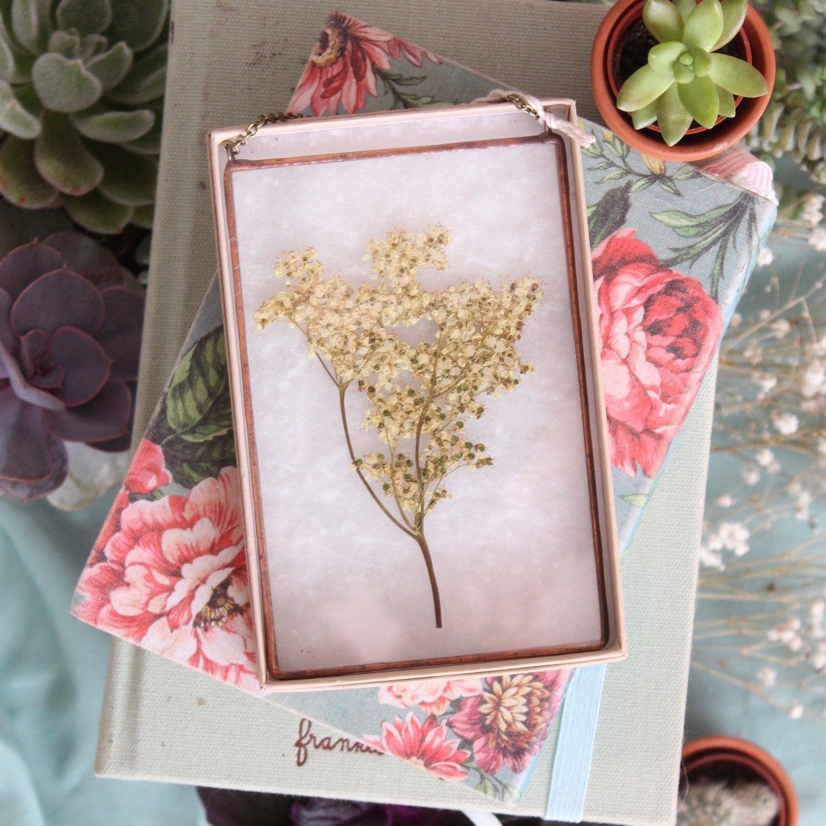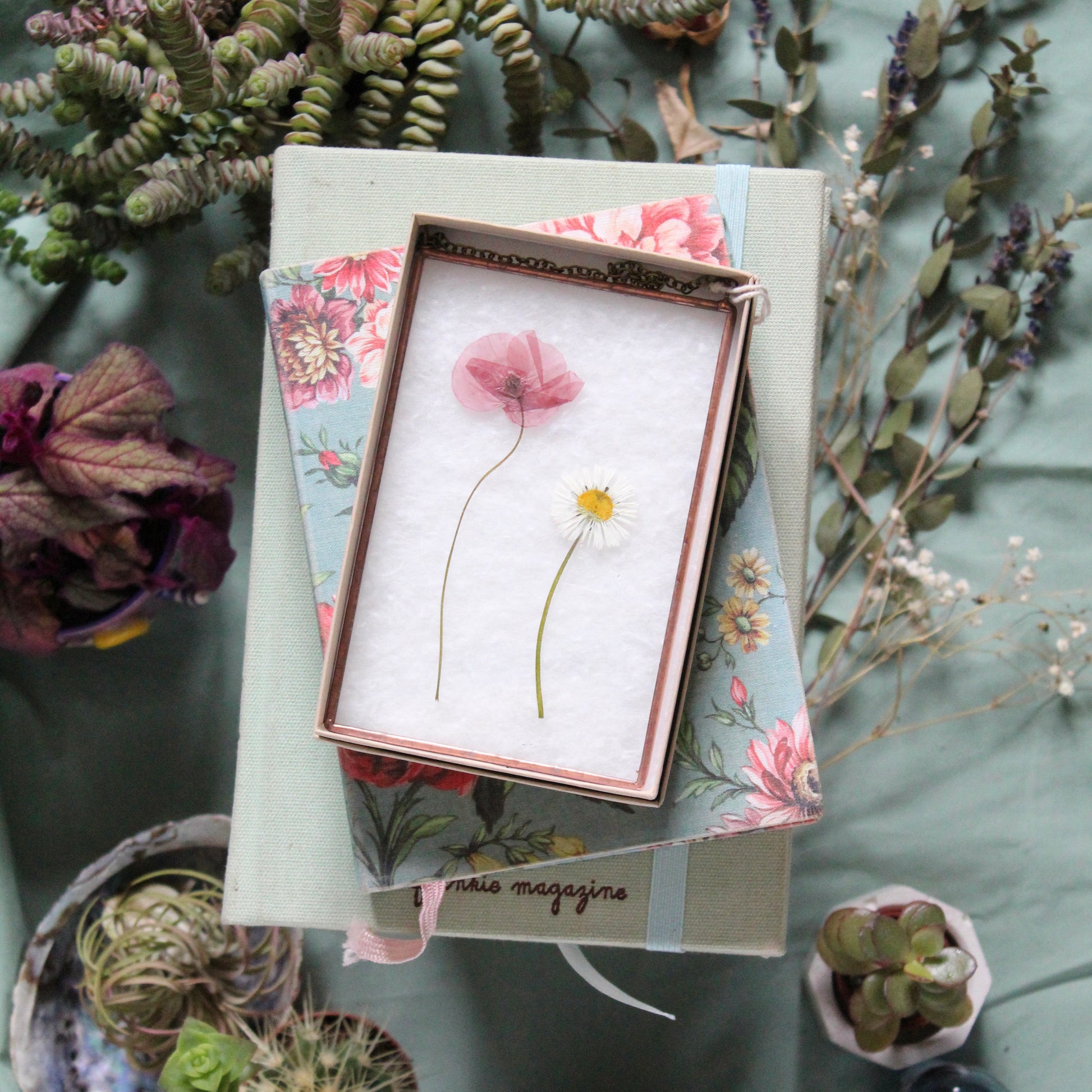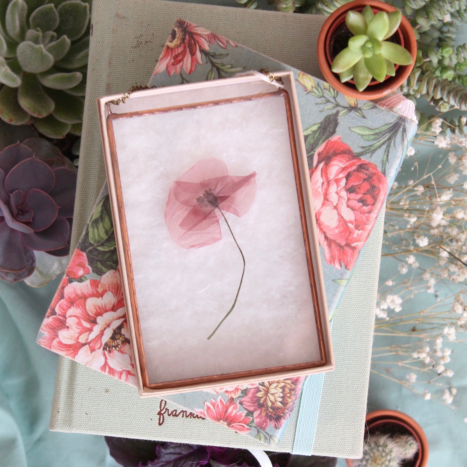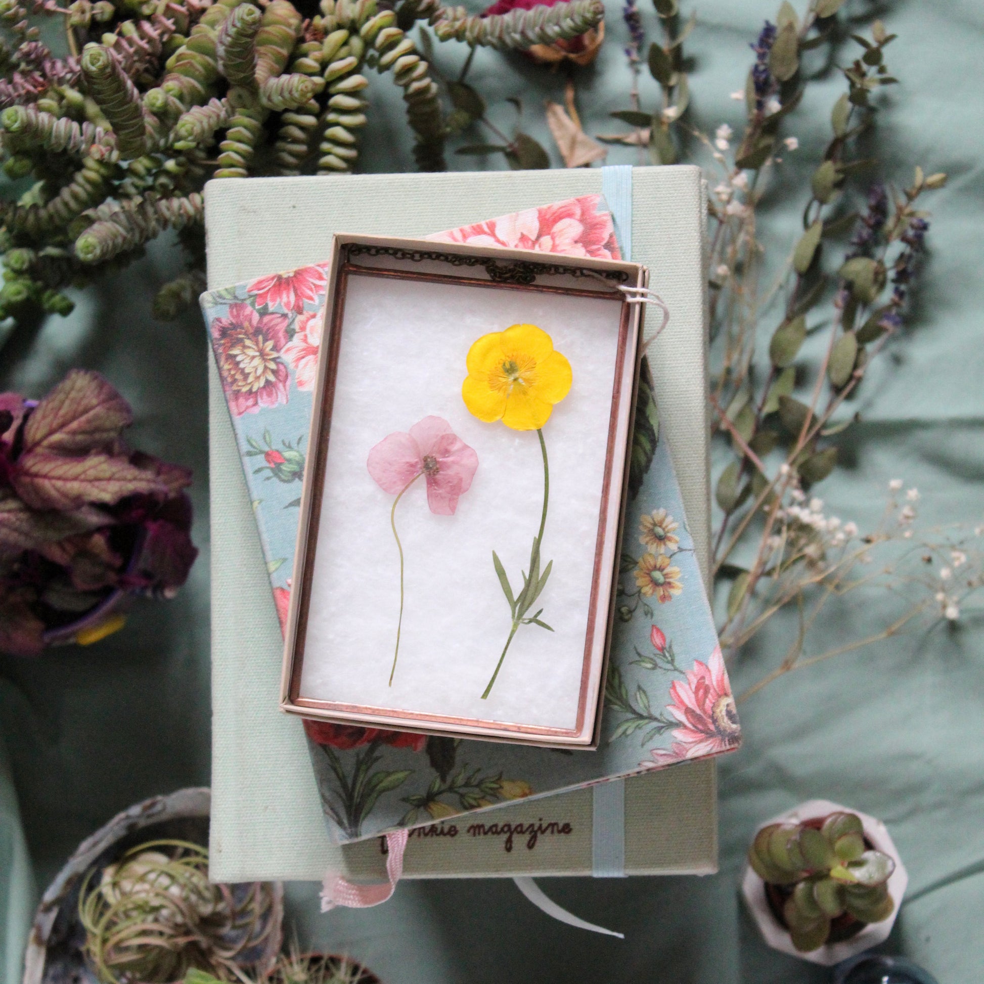 Each frame features real flowers whose colour will fade over time, so it is best to keep them out of direct sunlight. Comes in a copper finish.