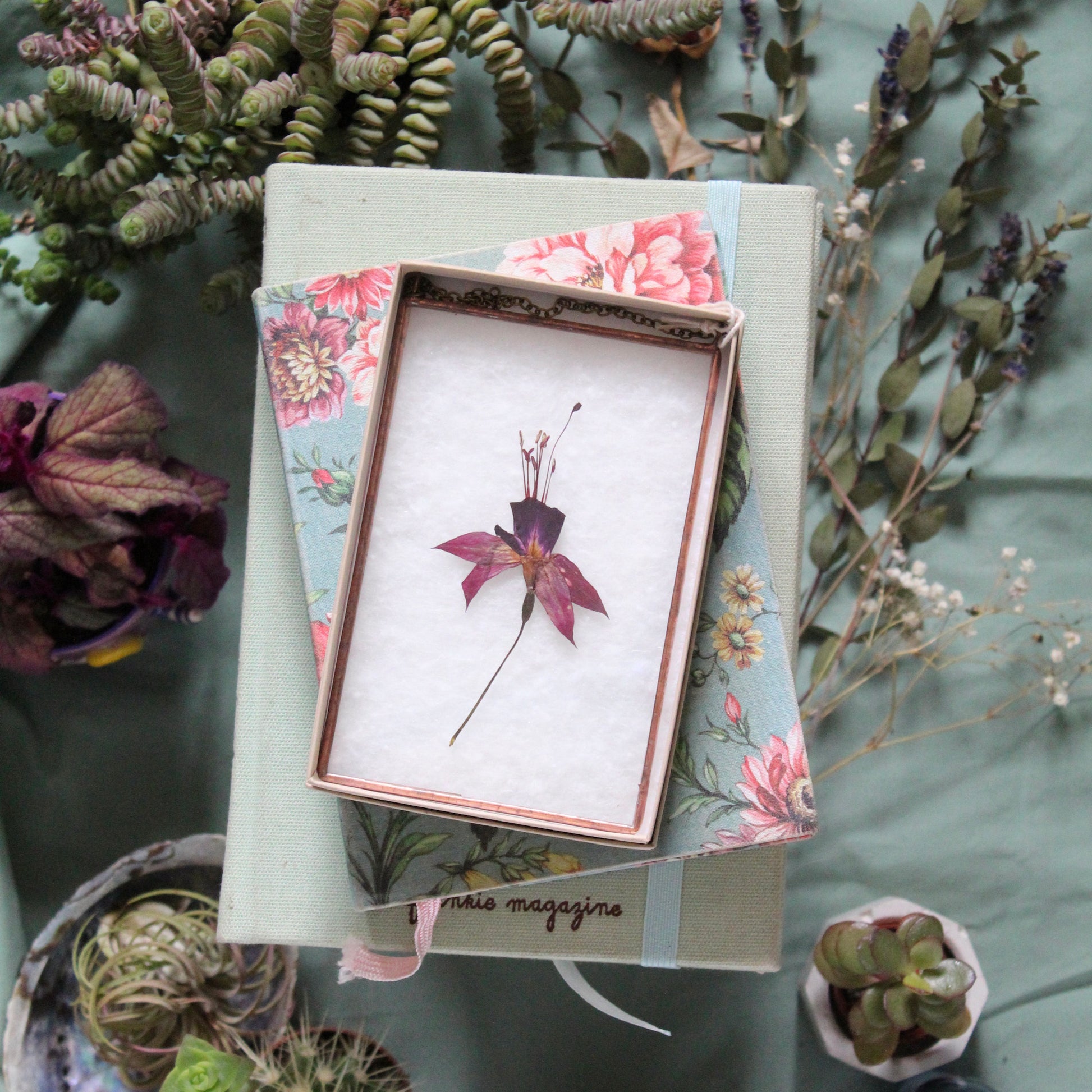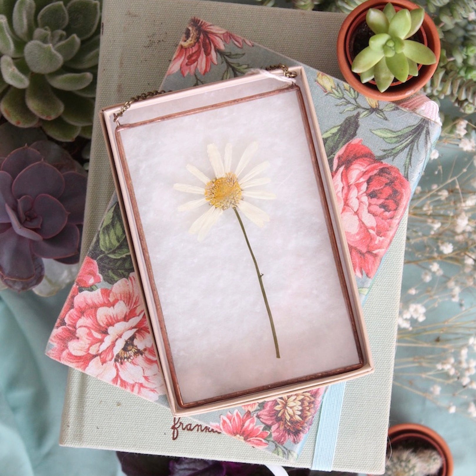 Picked in full bloom, each flower is carefully pressed for two weeks to preserve its delicate character. Arranged between 2 sheets of glass, the flowers seem to float in their frames, pure and timeless. Sealed with solder, I bring a raw beauty to each unique piece.