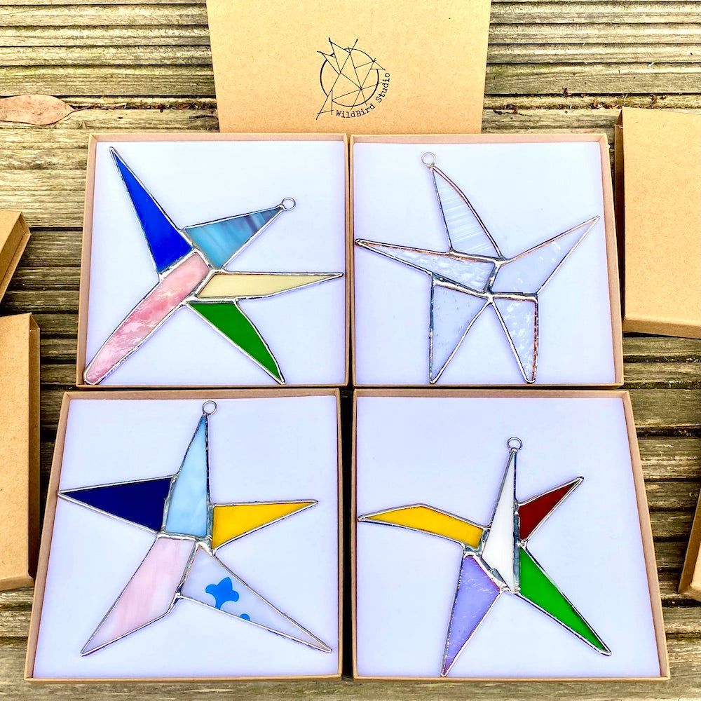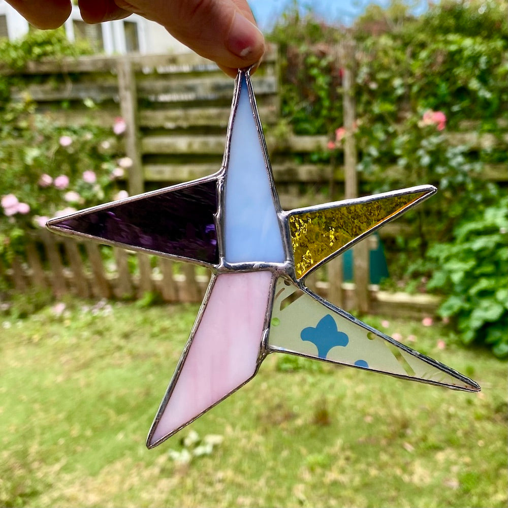 Sustainability is at the heart of everything I do. That's why I created my unique 'Wonky Stars'. When working with stained glass, I often end up with small, triangular offcuts. Instead of letting them go to waste, I developed a creative solution that embraces their individuality.
